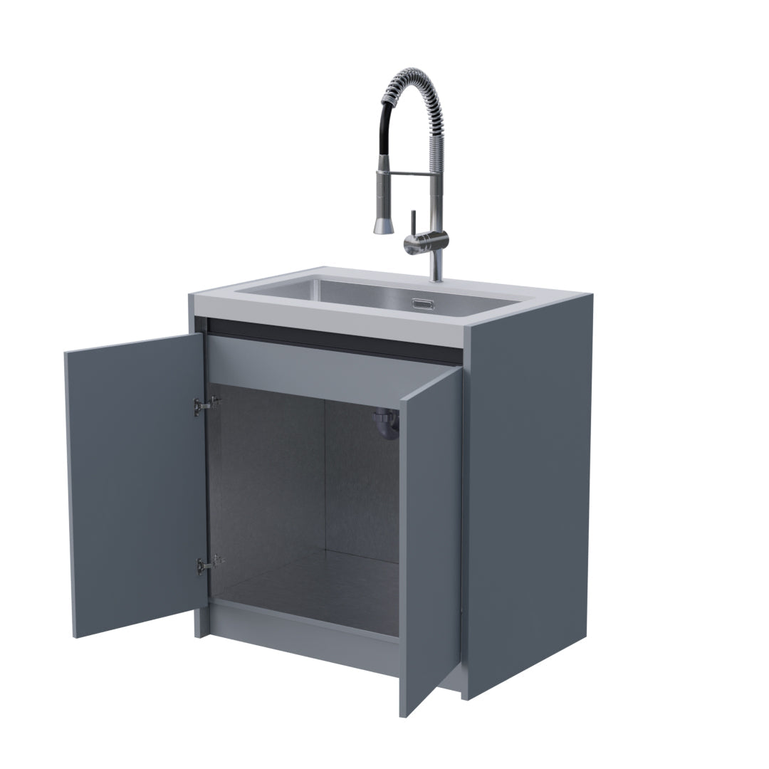 This set shows a pre-configured layout comprising Fridge, Gas Bottle Cabinet, BBQ, Sink, Triple Drawer Cabinet and Ceramic Egg Unit (Egg not included) which is available in Black or Grey finish, and a choice of Silver or Black BBQ.