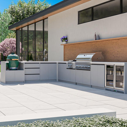 This set shows a pre-configured layout comprising all 8 available pieces: Fridge, Gas Bottle Cabinet, BBQ, Side Burner, 90 Degree Corner Unit, Double Door Cabinet, Triple Drawer Cabinet, Sink and Ceramic Egg Unit (Egg not included), which is available in Black or Grey finish, and a choice of Silver or Black BBQ.