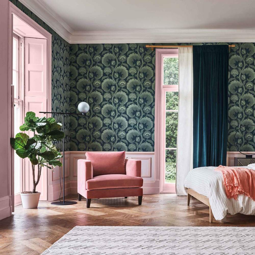 Fanfare Flock is a romantic and luxurious contemporary flock wallcovering derived from a classic 19th century archive design. Its feather-like leaves are enriched by the co-ordinating flock overlay, a process which was reintroduced to the market in the late 1800s by Cole & Son’s founder, John Perry.