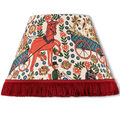 With metallic gold lining, this cone shade is finished with thick red fringing.