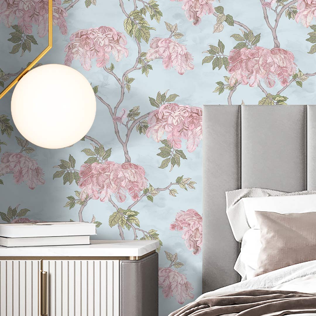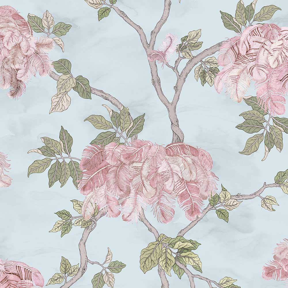 The Feather Palm Wallpaper by Brand McKenzie is a beautiful wallpaper full of style and vibrancy. This exquisite wall covering is a joyous combination of green floral and pink feathers, creating a spectacular feature wall in your interior space with eye catching detail. This sky blue finish would be particularly at home in a bedroom or behind a sofa.