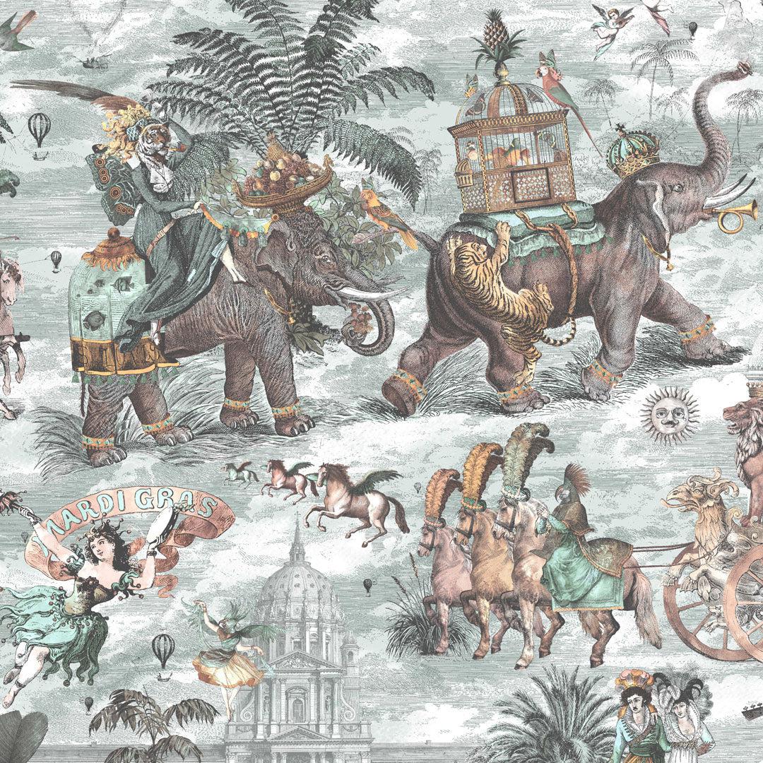 With Fiesta Wallpaper - Peach & Seawater by Brand McKenzie, bring the excitement and energy of a carnival to your walls. Enjoy majestic elephants marching in front of grand buildings, as the sound of music fills your home. Let your imagination be inspired as you admire the vibrant colours and whimsical imagery that make this wallpaper so unique. Hot air balloons and clouds drift through the sky, adding playfulness to any room.
