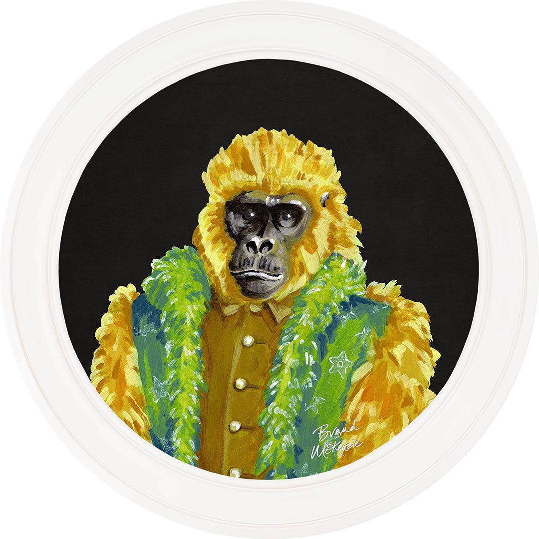 Command attention with the "Fine China - Gus" framed art print by Brand McKenzie. This majestic golden gorilla exudes vintage rockstar charisma in his chartreuse faux-fur coat with embroidered lapels and military button-up. Gus perfectly blends funk and fashion with his serious stare and effortless cool. Add a touch of regal rebellion and undeniable style to your home with this impressive primate.
