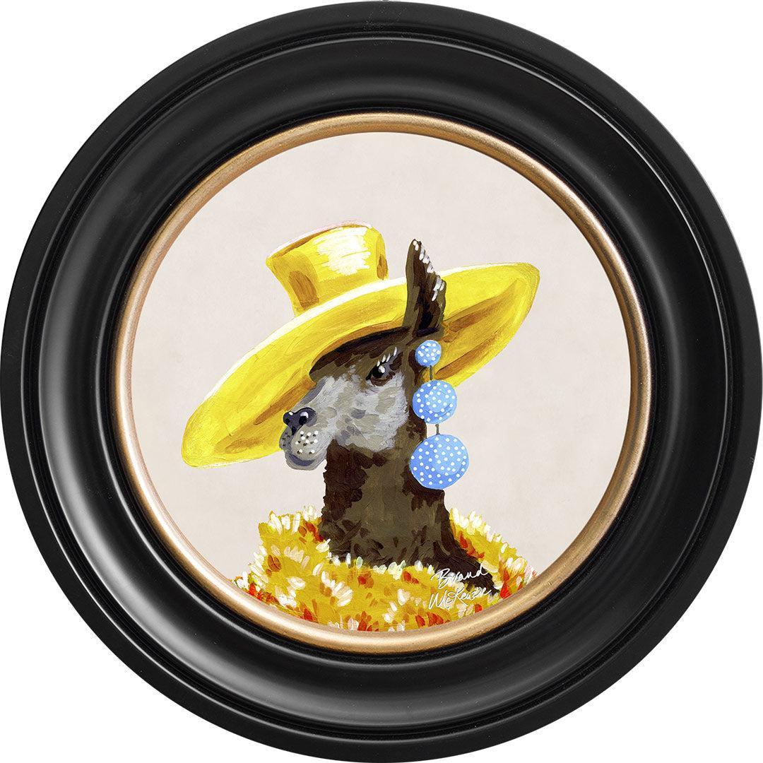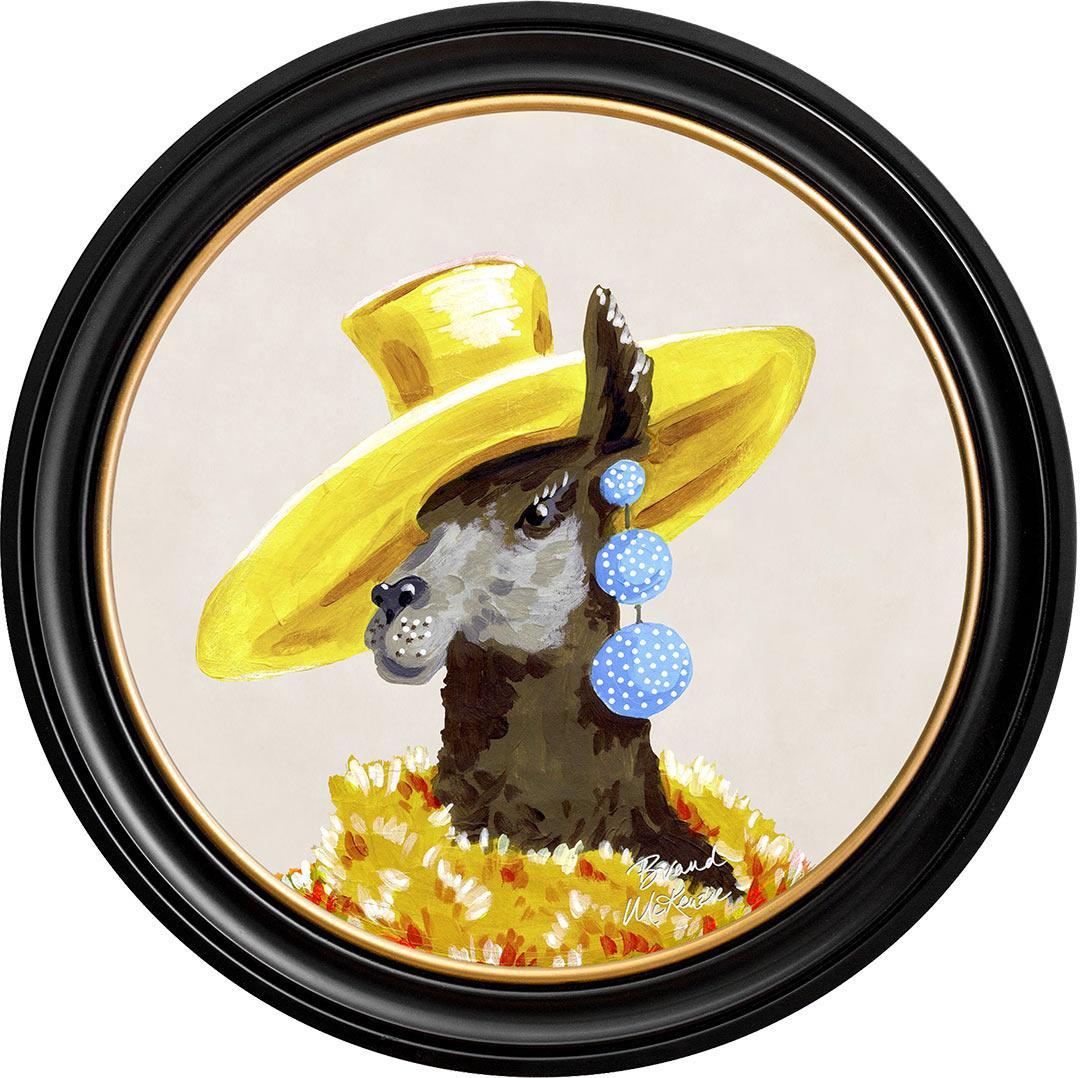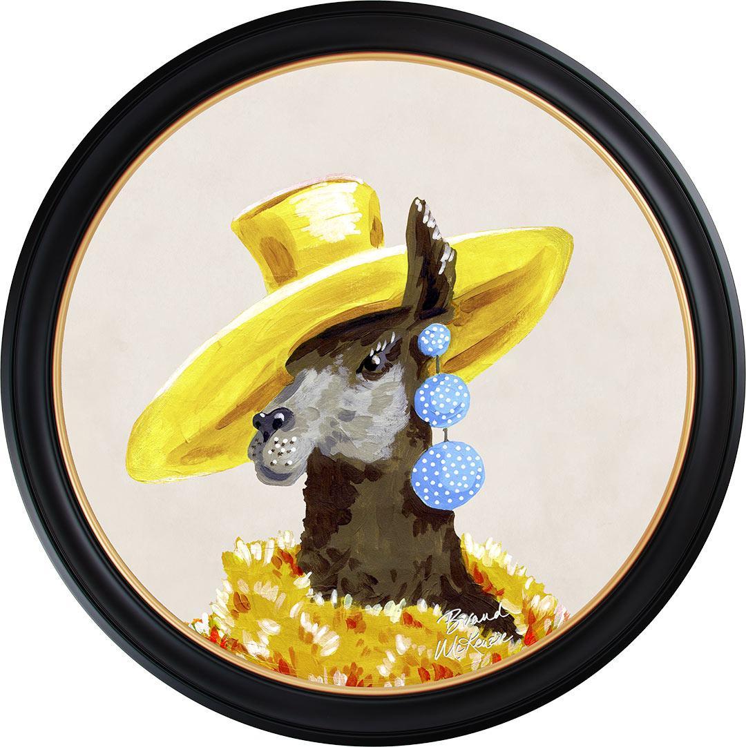 Bring a touch of grassland glamour to your walls with the "Fine China - Lily" framed art print by Brand McKenzie. Lily, a stylish llama, is the epitome of countryside couture, sporting an oversized sunshine-yellow hat and a delightful cascade of polka-dot earrings. Wrapped in a warm and dramatic golden floral feathered boa, she exudes elegance and sets her own trends with graceful poise. Embrace the fabulous life with Lily's charming presence in your home.