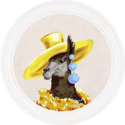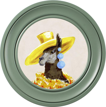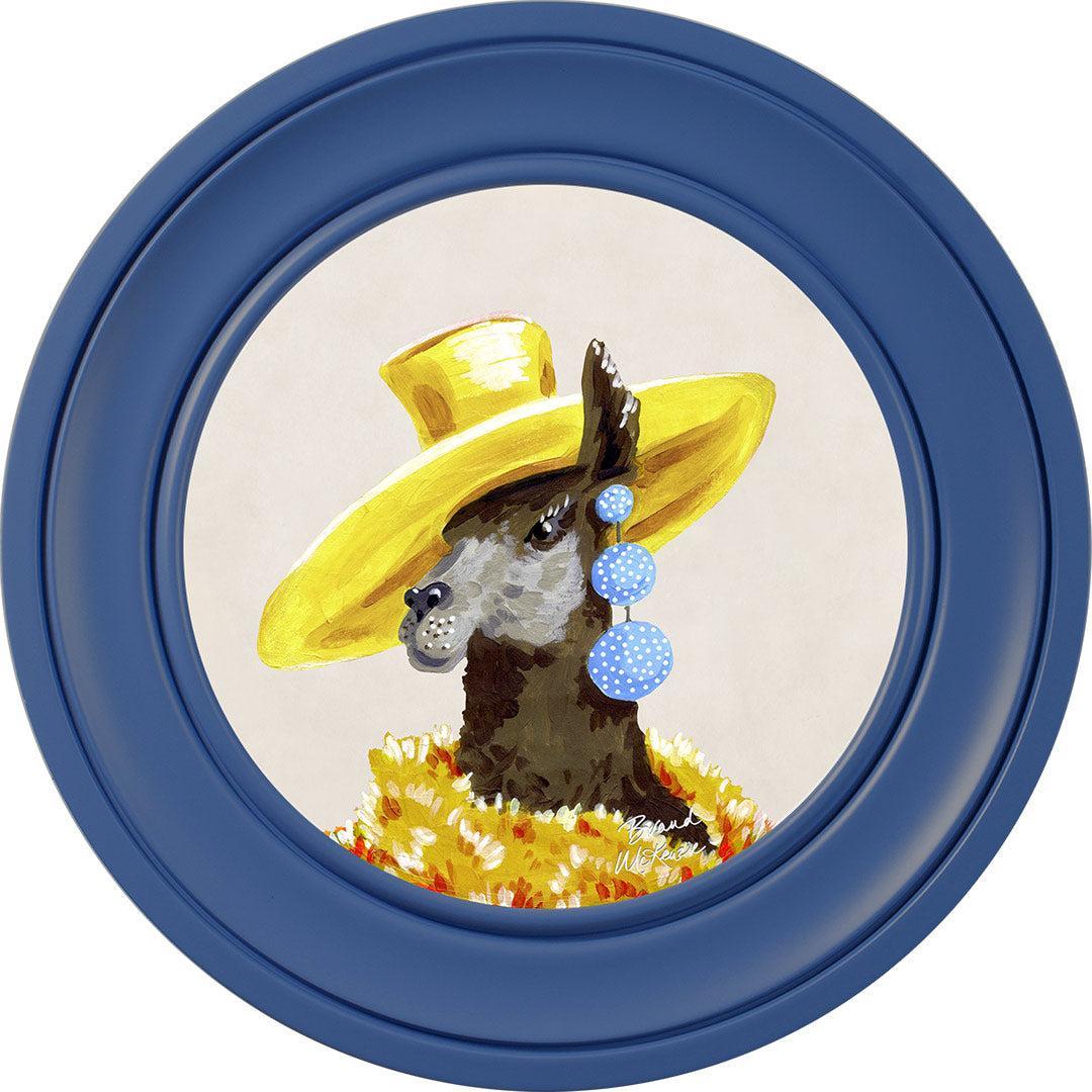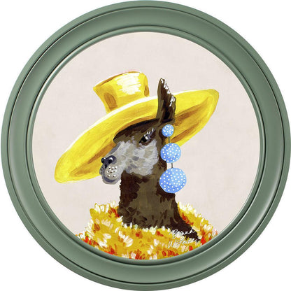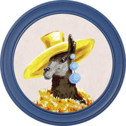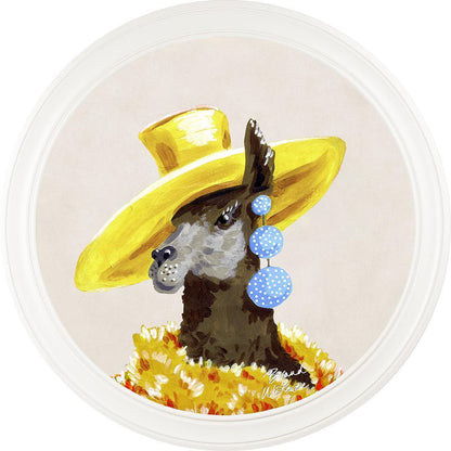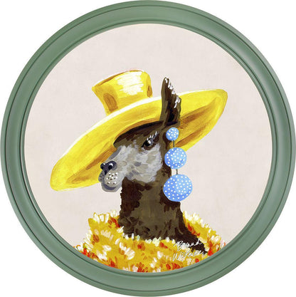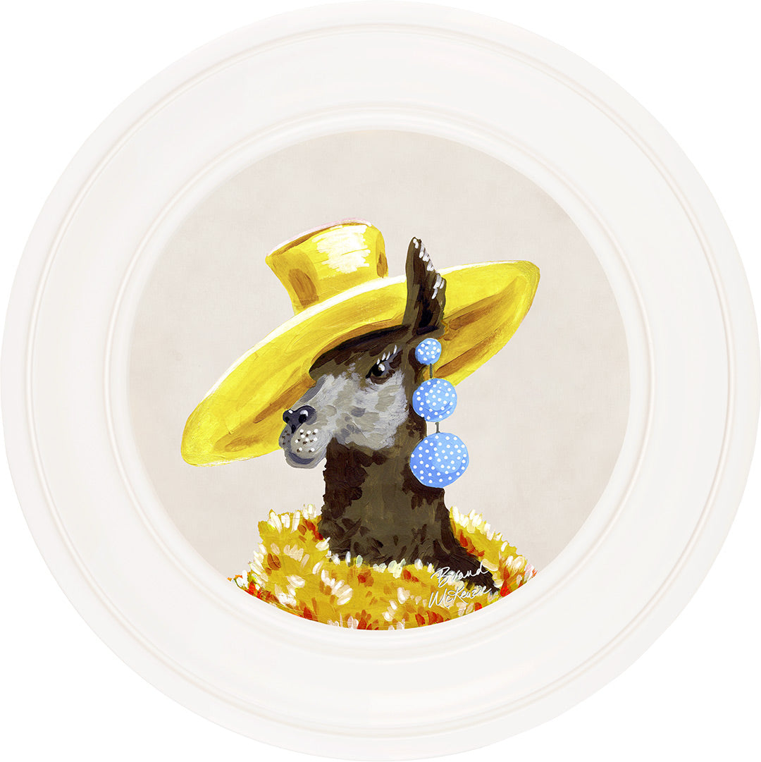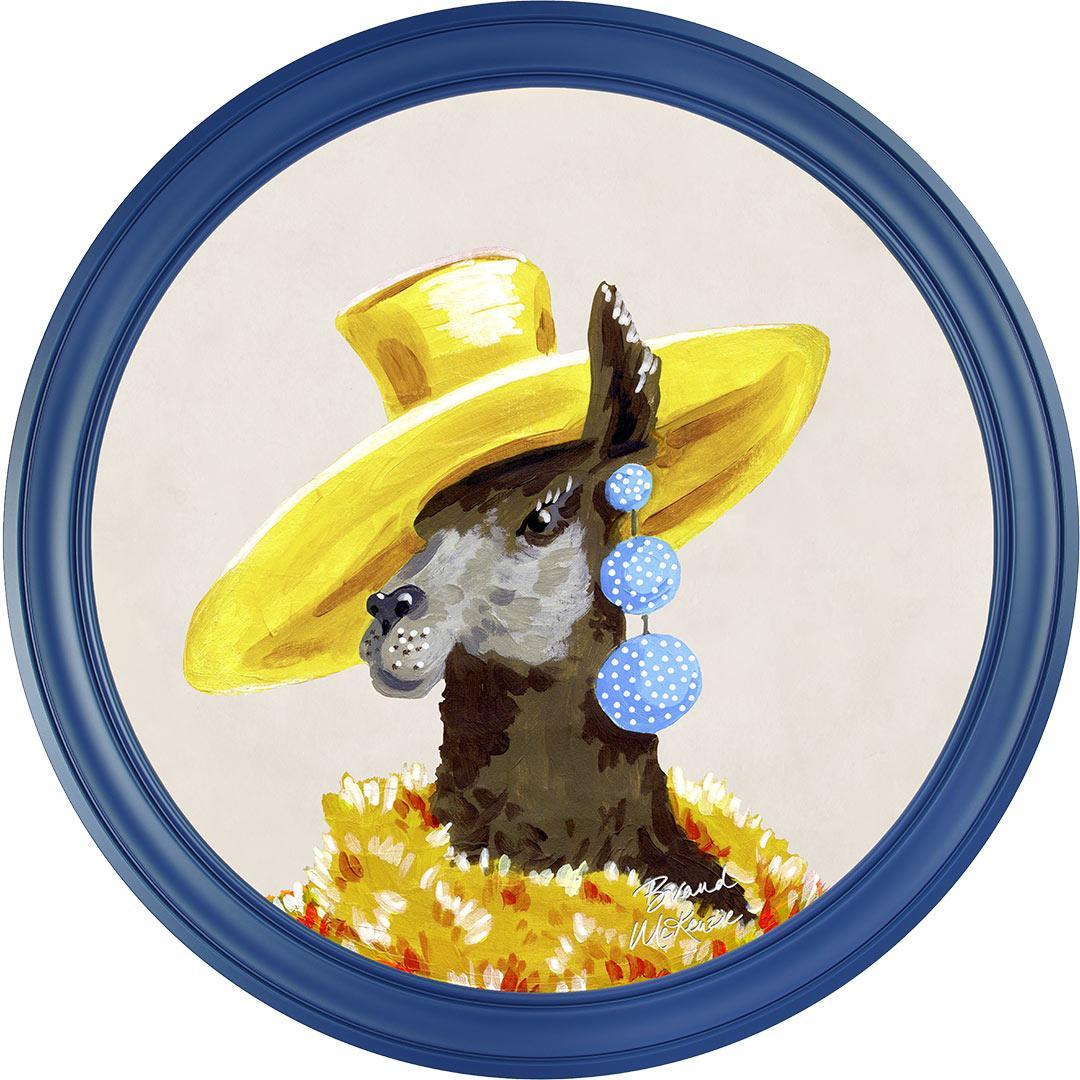 Bring a touch of grassland glamour to your walls with the "Fine China - Lily" framed art print by Brand McKenzie. Lily, a stylish llama, is the epitome of countryside couture, sporting an oversized sunshine-yellow hat and a delightful cascade of polka-dot earrings. Wrapped in a warm and dramatic golden floral feathered boa, she exudes elegance and sets her own trends with graceful poise. Embrace the fabulous life with Lily's charming presence in your home.