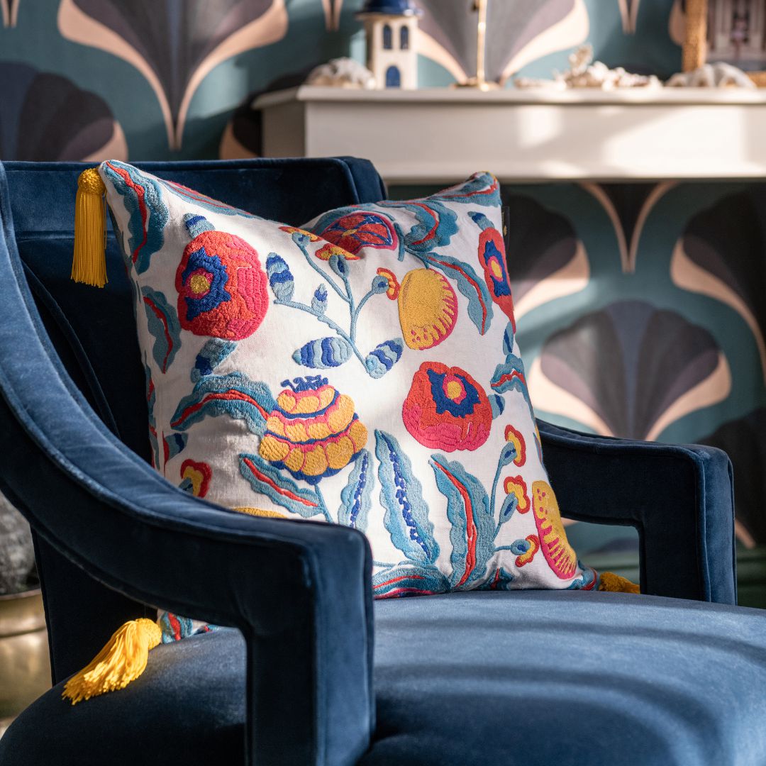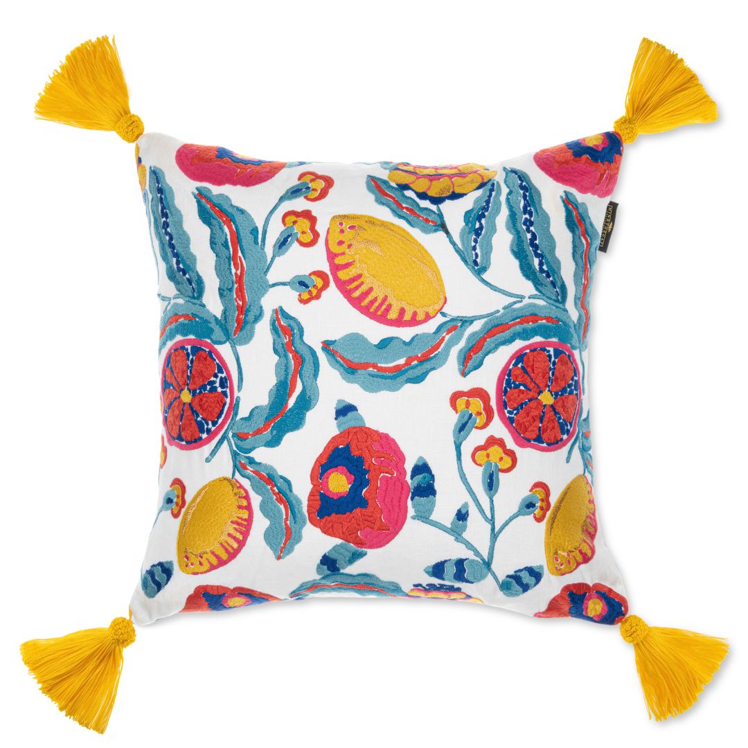 Infuse your space with the warmth and vibrancy of a sun-soaked Italian summer with the Fiori Di Limone Embroidered Cushion by MINDTHEGAP. Inspired by the lively hues and scents of citrus orchards and blooming flowers, this exquisite piece brings the refreshing allure of Mediterranean gardens right into your home. Set against a fresh white backdrop, the intricate embroidery captures the playful elegance of lemons and blossoms, evoking the essence of a serene, sun-filled retreat. Finished with bright yellow tassels at each corner, Fiori Di Limone adds a touch of Italian countryside charm, perfect for creating an atmosphere of everyday luxury and relaxation.