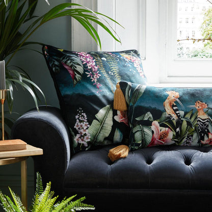 The Floral Garden Piped Velvet Cushion, is a luxurious and sophisticated home accessory that will instantly upgrade any space. This cushion cover is made from sumptuous velvet fabric in a deep inky charcoal colour and features beautiful botanicals, fruits and florals inspired by the gardens of Petra.