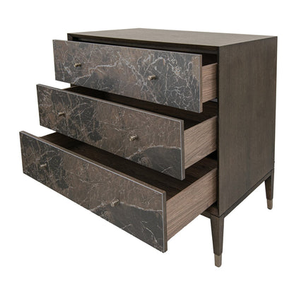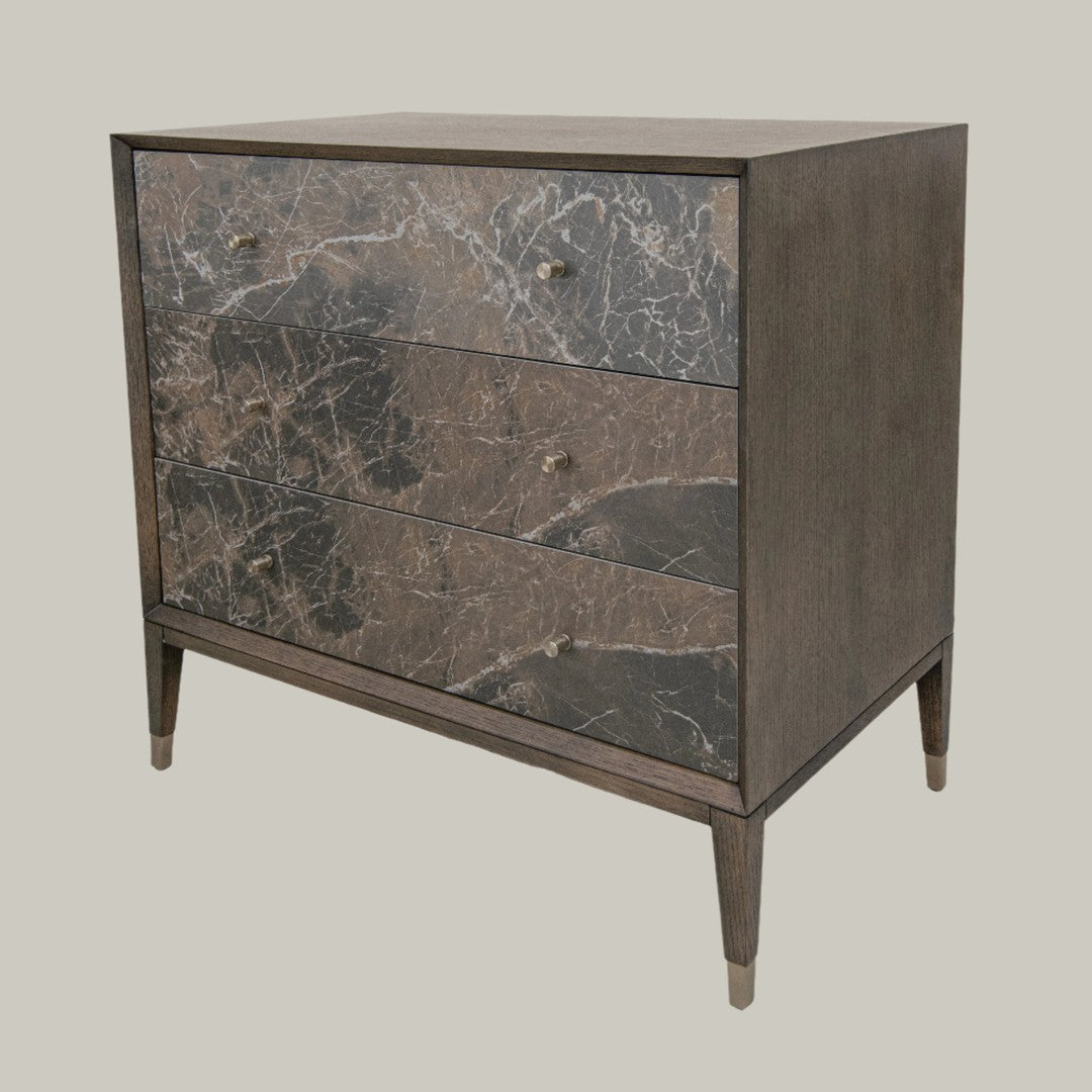 The drawer fronts are adorned with a striking marbled design, adding depth, visual intrigue, and a touch of opulence. Each of the three spacious drawers is accented with brushed muted bronze handles, offering a refined contrast that enhances the chest’s overall elegance. The design is further elevated by slim, tapered legs capped with metallic accents, contributing to its sleek, modern aesthetic while ensuring stability.
