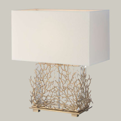 The Gable Table Lamp by RV Astley is a luxurious statement piece that combines elegance and contemporary design, perfect for adding a sophisticated touch to any interior. This lamp features a distinctive base crafted from high-quality materials, resembling intricate coral branches in an antique brass finish, giving it a unique, organic look inspired by nature. The coral-like structure brings a touch of coastal charm, yet its metallic finish ensures it fits seamlessly into modern or classic décor styles alike. Topped with a large, rectangular fabric lampshade in crisp cream, this lamp diffuses light evenly, creating a warm and inviting ambience suitable for living rooms, bedrooms, or even high-end office spaces.