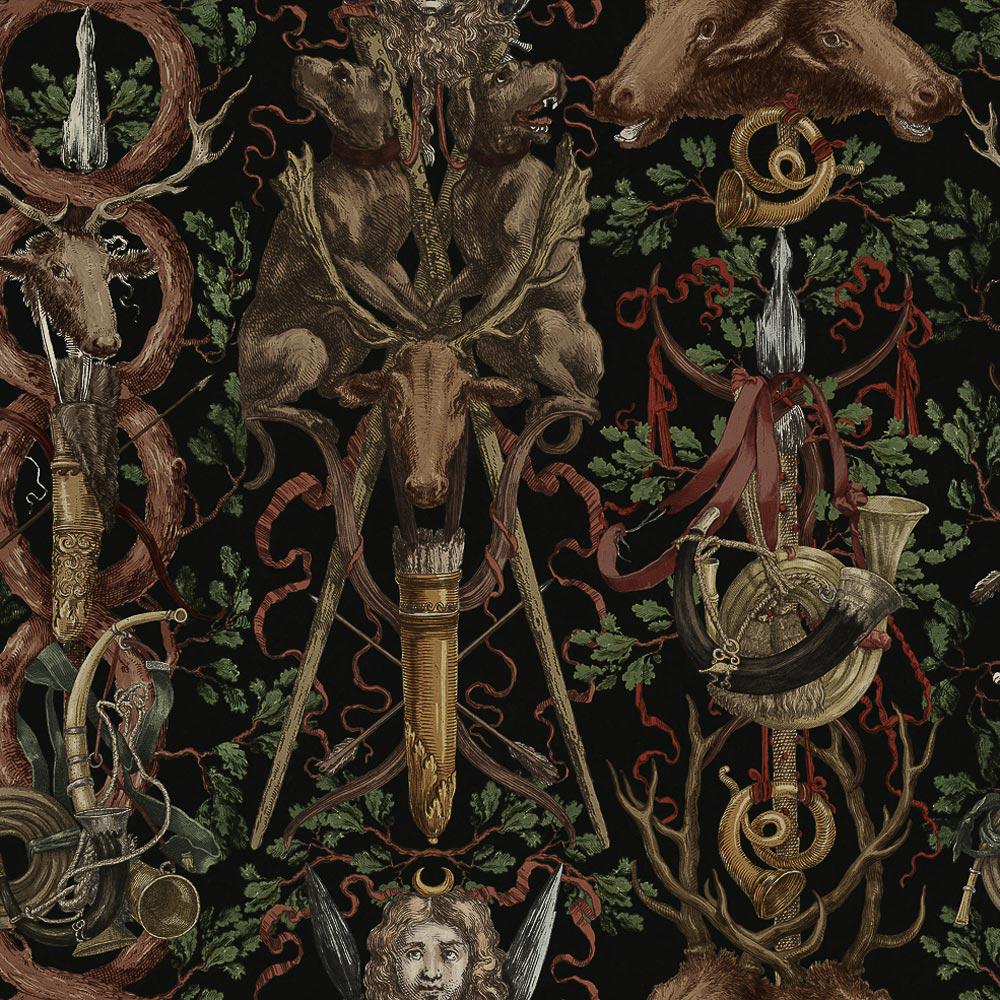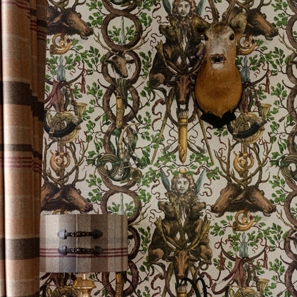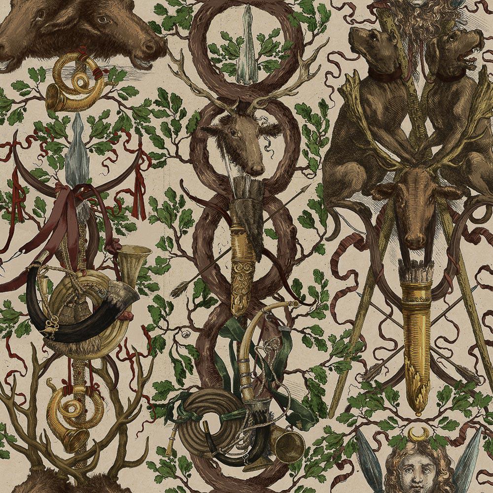From the first glance, Ganghofer Hunt Wallpaper by MINDTHEGAP evokes a feeling of sophistication and luxury. The design features a beautiful tapestry of ancient, twisted oak trees, with majestic beasts abound. Stags and mountain dogs are prominently featured in the design, giving it a regal look and feel.