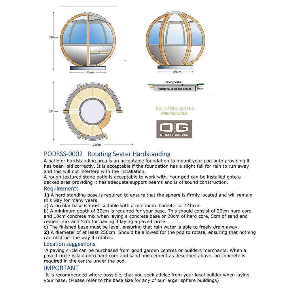 Prices include delivery and assembly on the understanding that you have a pre laid hard standing. An area of 246cm x 246cm is required for the Rotating Seater to rotate freely. A hard standing base of no less than 140cm x 140cm is required to build your Rotating Seater onto. Your sphere can be installed onto a level paved, concrete or decked area. If you are preparing a new concrete or paving area for your Rotating Seater, we recommend an overall depth of 30cm allowing 7 days for the ground to settle prior to the arrival of the fitting team.