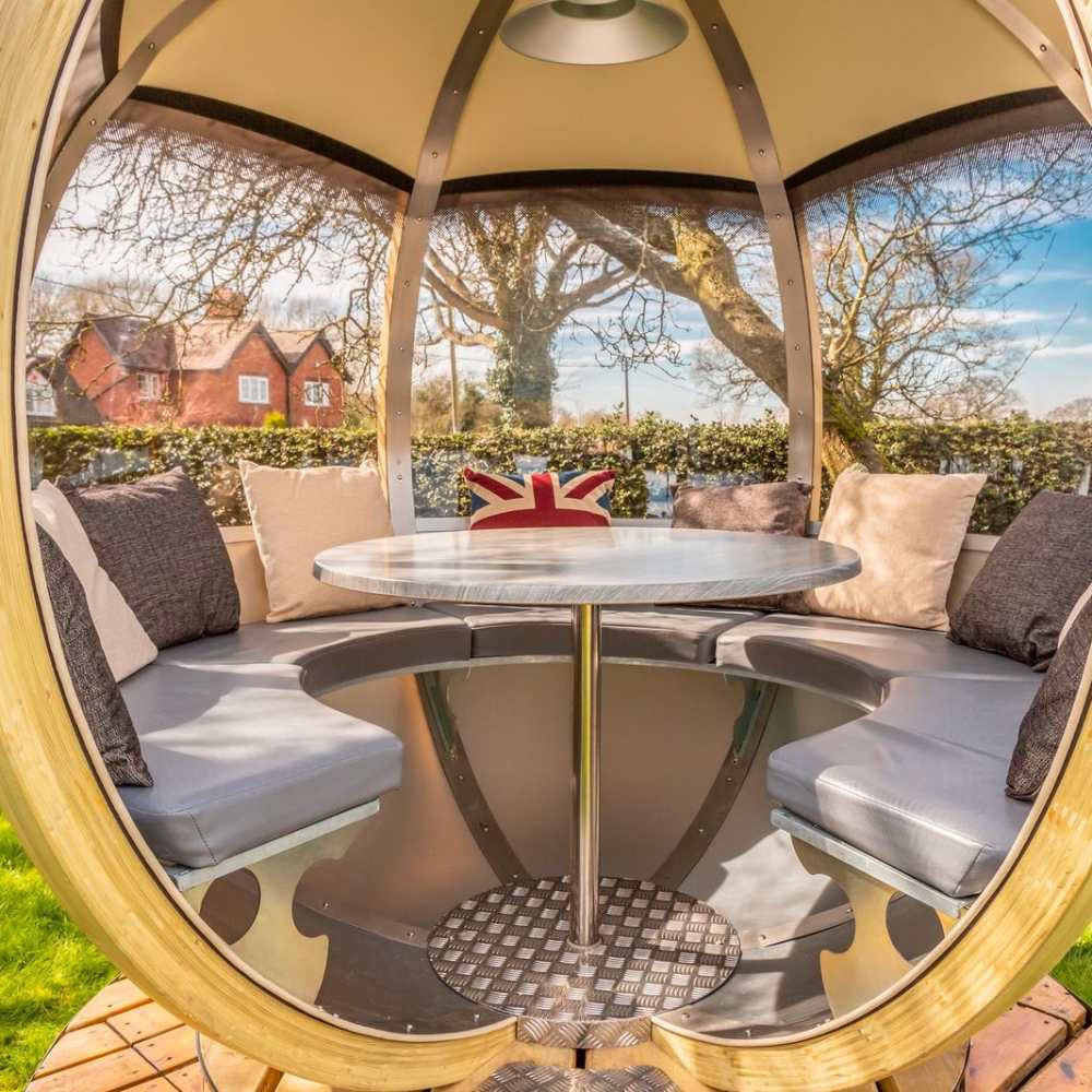 Six laminated treated sustainable spruce timber arcs house five acrylic tinted windows that offer a full panoramic views. The seating area of 2.4m diameter will comfortably accommodate 7 guests.