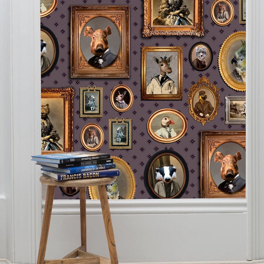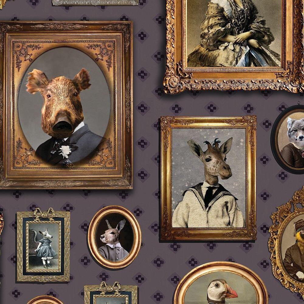 Our fabulous Portrait Gallery Wallpaper designed by Charlotte Cory for Graduate Collection features gloriously quirky animals reworked into Victorian photography in a stylish Mauve colourway.