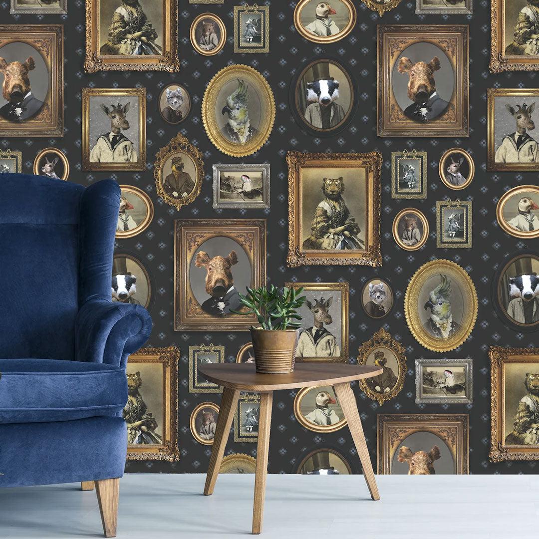 This fascinating and stylish Portrait Gallery Wallpaper designed by Charlotte Cory for the Graduate Collection features gloriously quirky animals reworked into Victorian photography on a Navy background.
