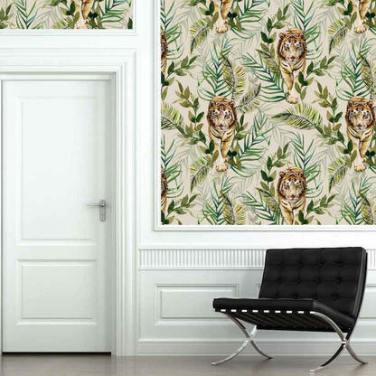 This stunning paste the wall wallpaper captures the strength and majesty of the mighty tiger. This imagery paired with a sophisticated colour palette creates a new take on the popular jungle trend.