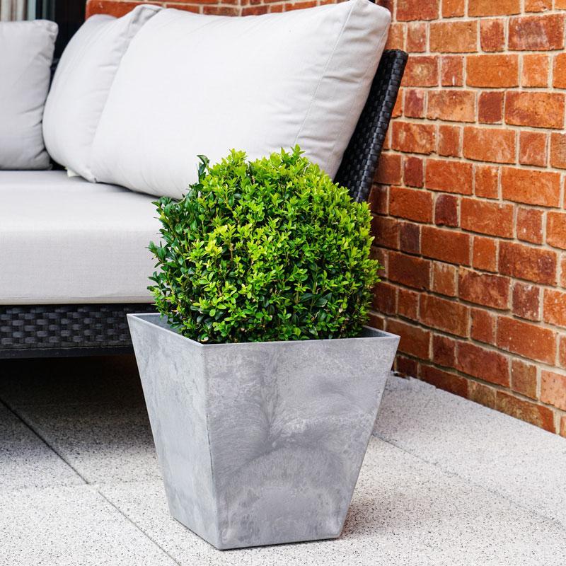 This stylish square grey 35cm Artstone plant pot will create a striking first impression, made from a stone and synthetic mix this planter has a unique stone effect finish with the advantages of being lightweight.
