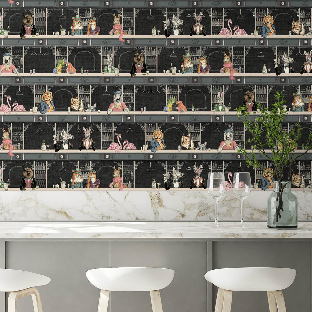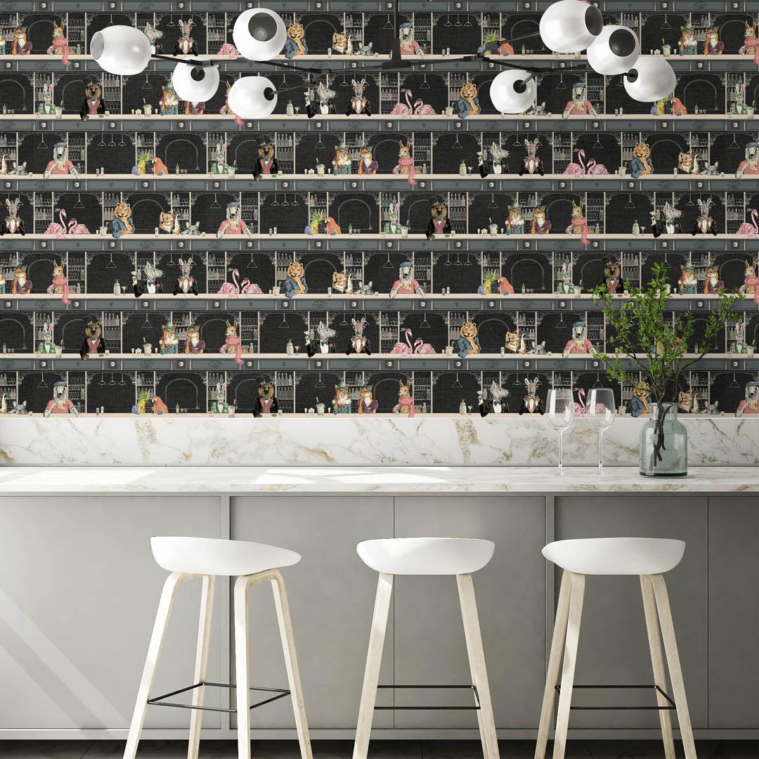 With its dark backdrop and slate-coloured bar, this wallpaper lends a hint of chic to any room. From lions to parrots, dogs, and flamingos, the critters in this arresting design guzzle their drinks amid the opulence and glitz.
