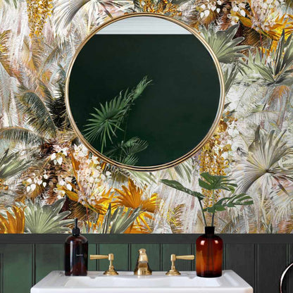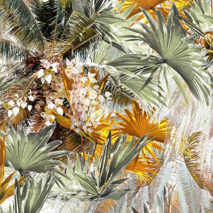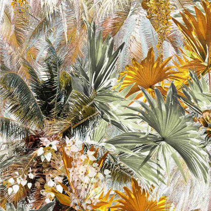 Depicting intricate palms and leaves in a stunning blend of gold, ivory, sage, dark green, brown, and silver it creates a vibrant yet elegant aesthetic. It makes a fabulous choice for a stylish, modern living room.