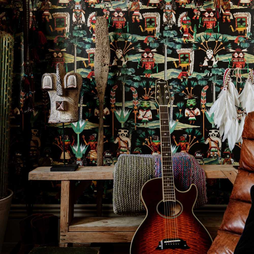 The Hopi Spirit pattern embraces age old rituals of the custodians of this ancient land in simple primary tones, with palms, spirit sticks and mounds of earth forming an almost linear pattern. The intriguing characters perform under the Arizona moon in this dramatic anthracite colourway.