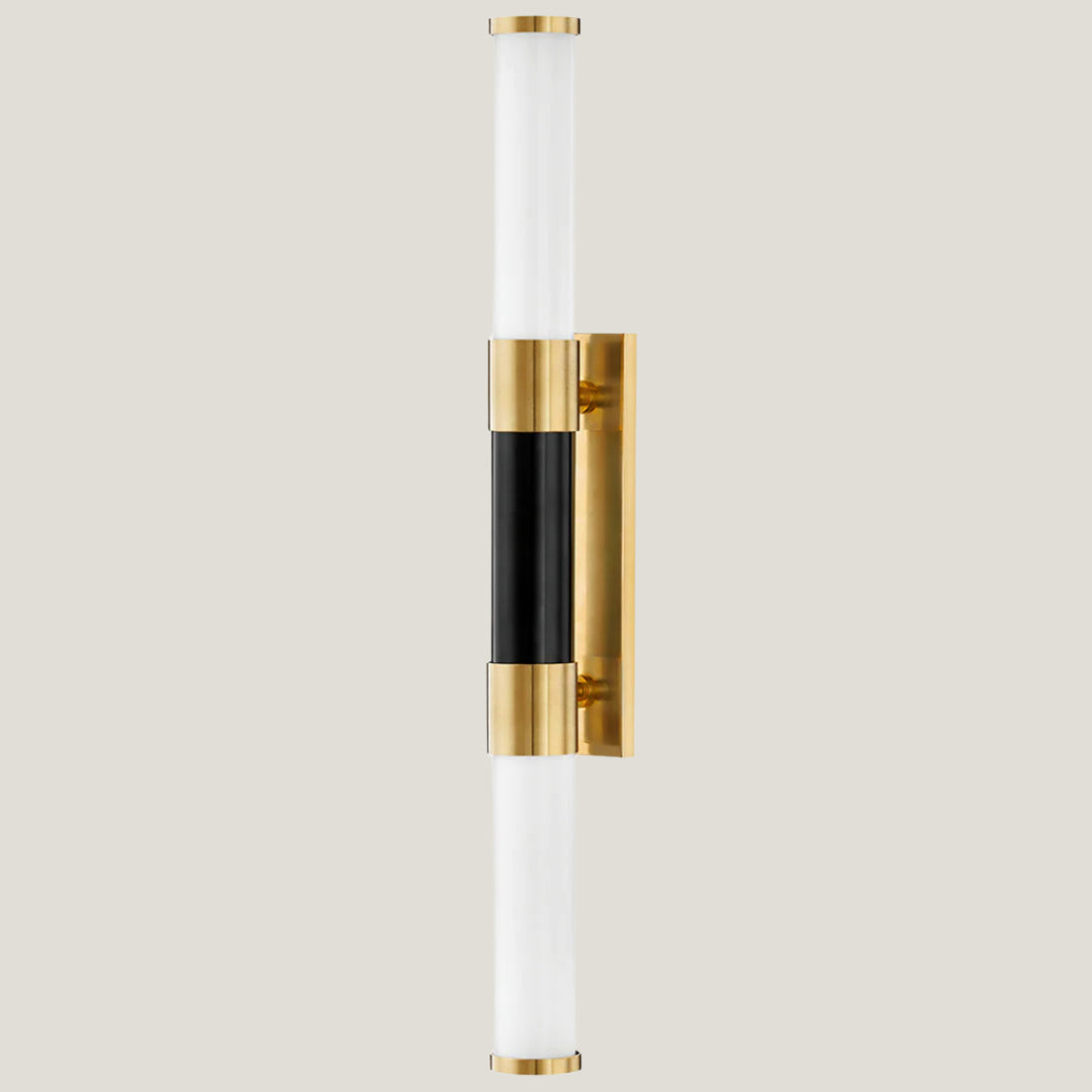 This stunning wall light features a sophisticated linear design in aged old bronze and black that encompasses sleek milk-glass tubes for a resplendent glow. The dazzling caps on either end add an extra touch of refinement and radiance.
