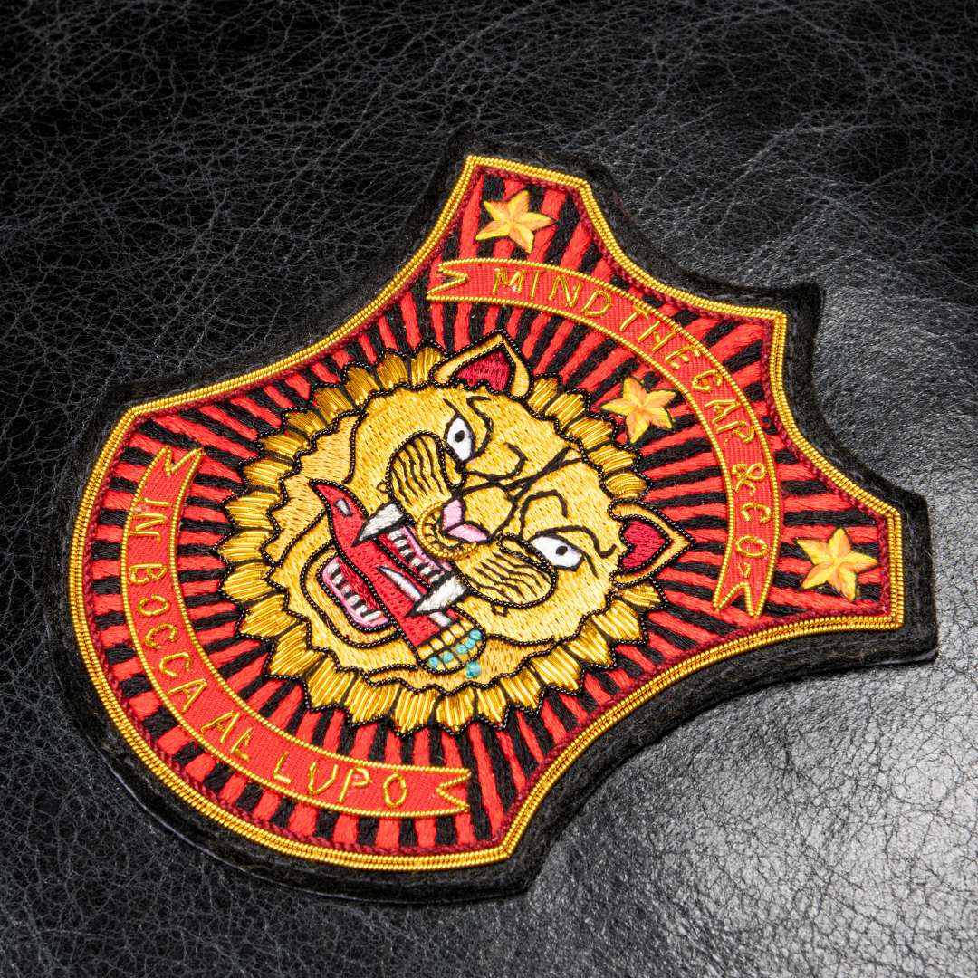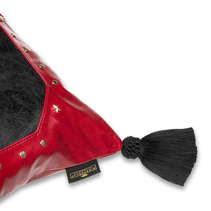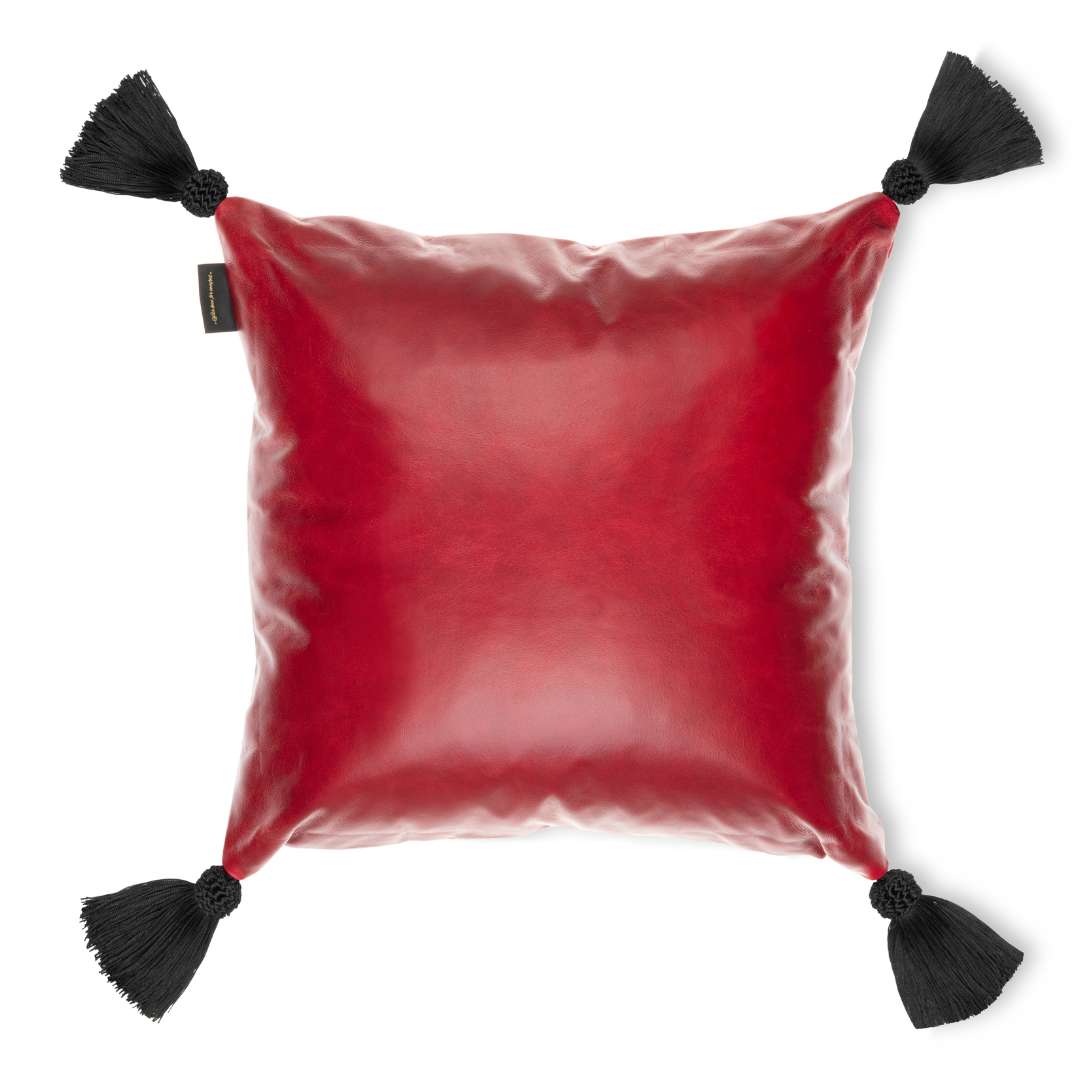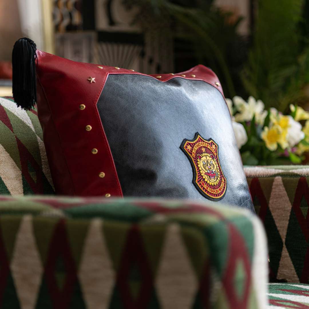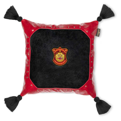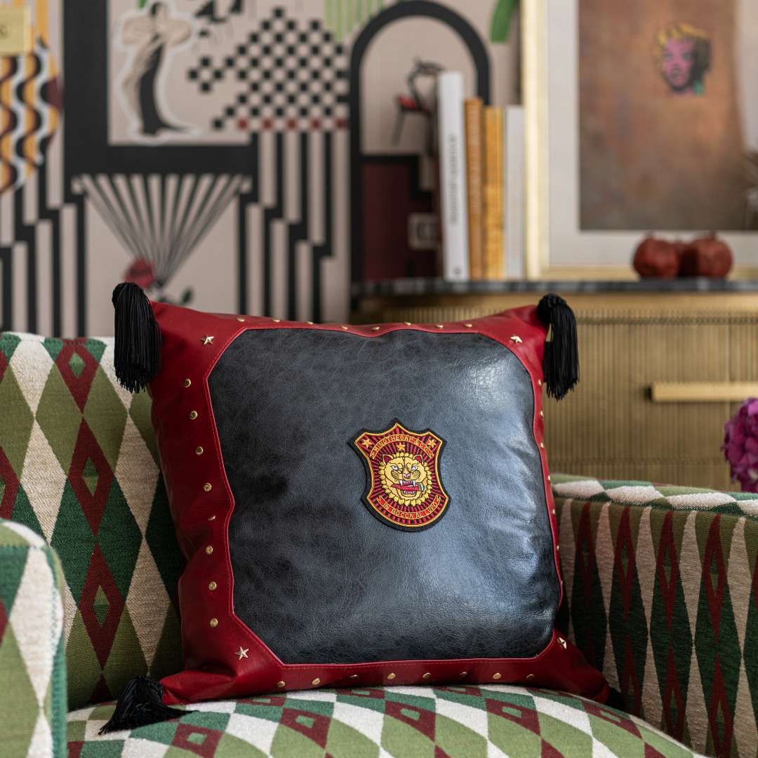 Designed for interior designers, decorators, and style enthusiasts, the In Bocca Al Lupo Leather Cushion from MINDTHEGAP is a statement piece crafted from luxurious red Italian leather, accented by a striking black square centrepiece. An intricate lion crest is embroidered in golden metal thread at its core, showcasing the lion’s fierce expression as it clutches a vibrant red chilli pepper. Symbolising strength and courage, the lion stands out against a bold black and yellow backdrop. Finished with four elegant black tassels at each corner, this cushion infuses any space with a blend of bold sophistication and refined elegance.