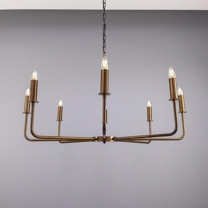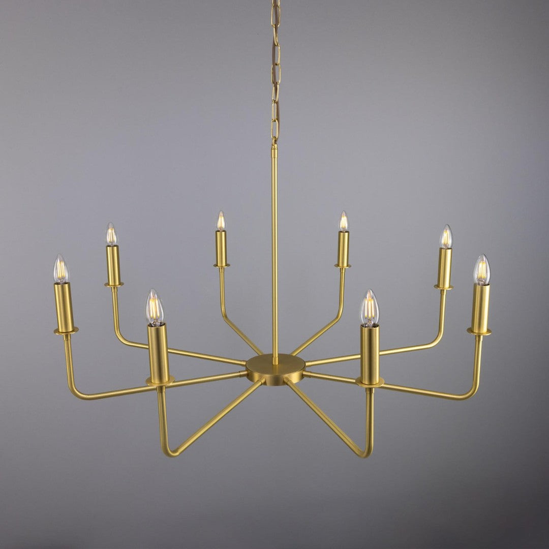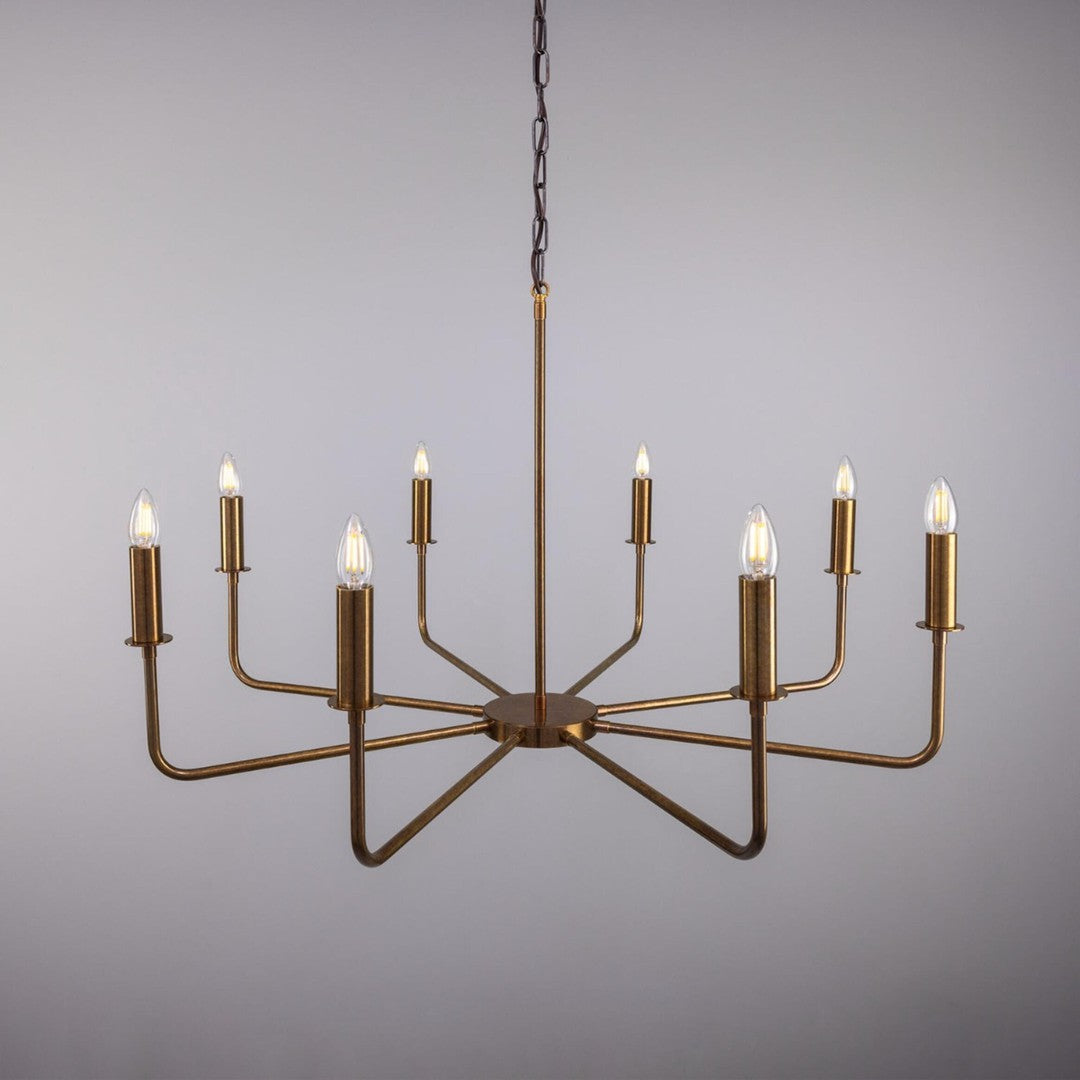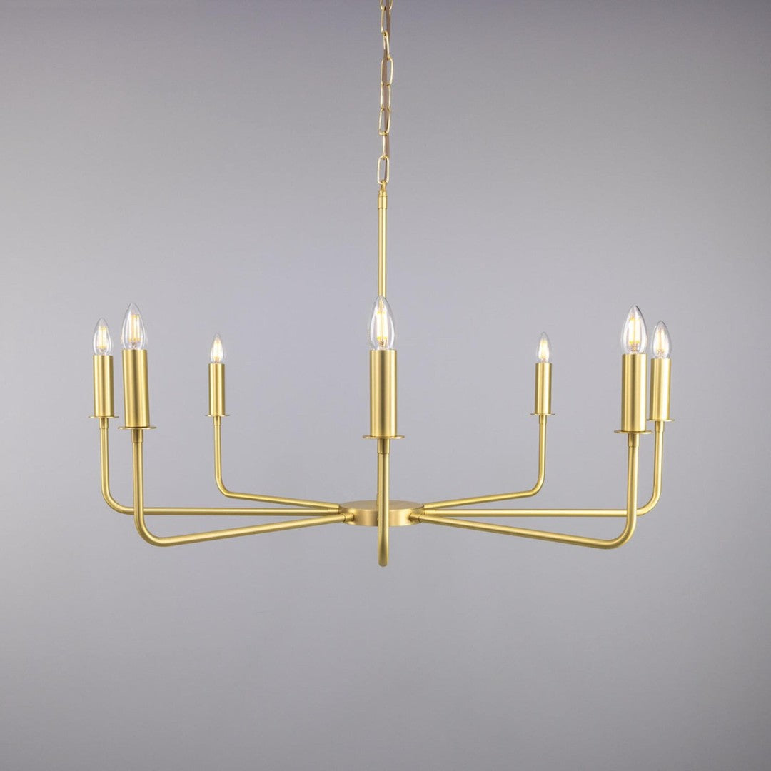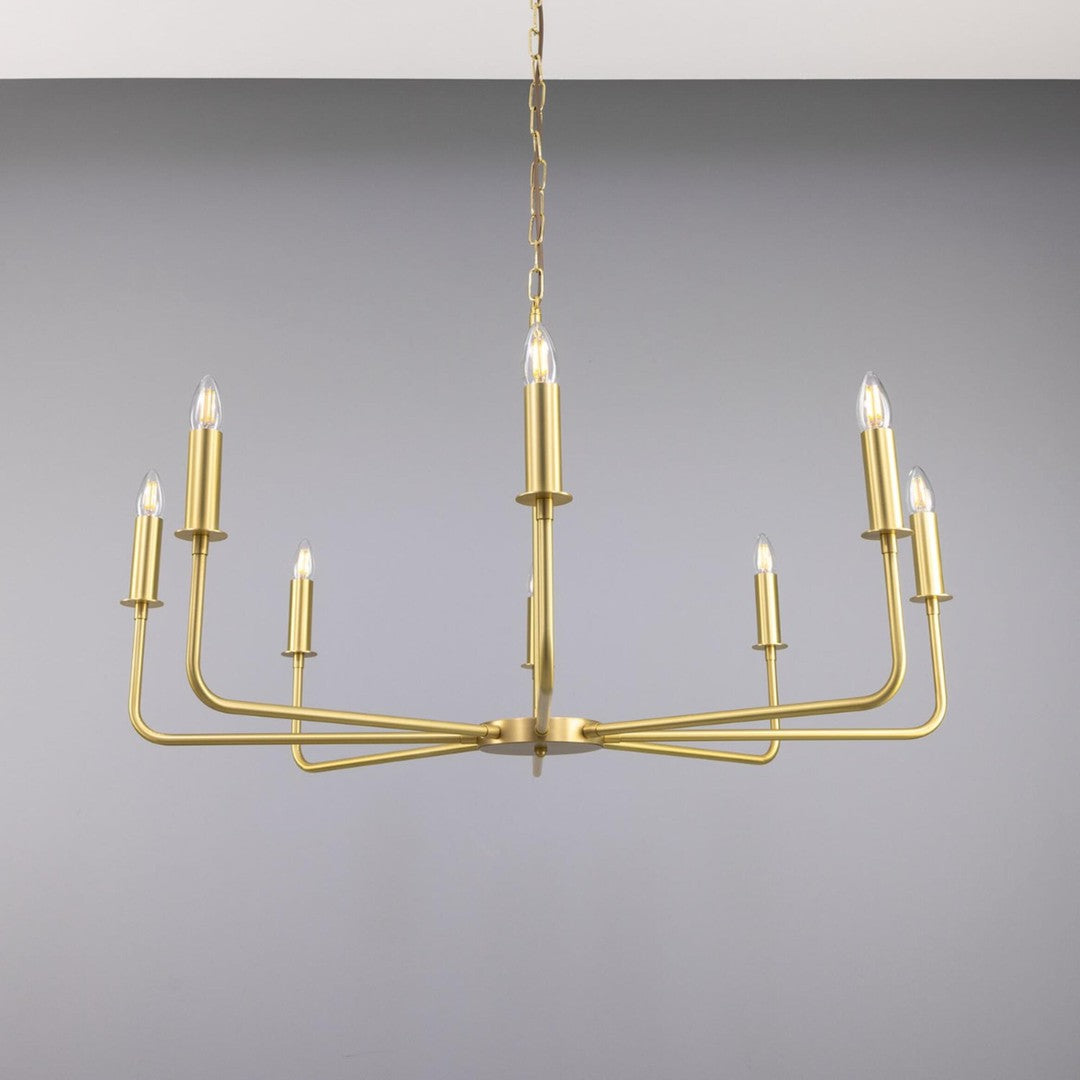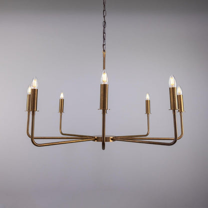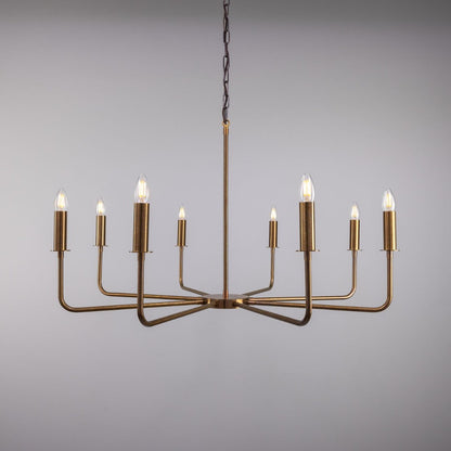 The Irvine chandelier features a sleek central brass tube that descends from the ceiling, creating a stunning focal point. From there, eight arms extend horizontally to hold modern candle-style lamp holders. Each arm is delicately curved, adding an unexpected touch of sophistication to the overall design.