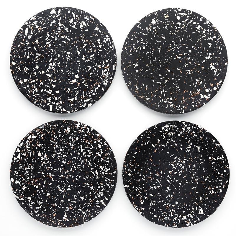 This darkside jesmonite terrazzo placemat is handmade by UK designer Emily Marlin and is created using jesmonite with black, white and copper fragments.