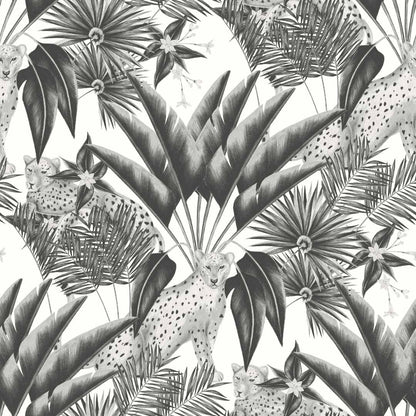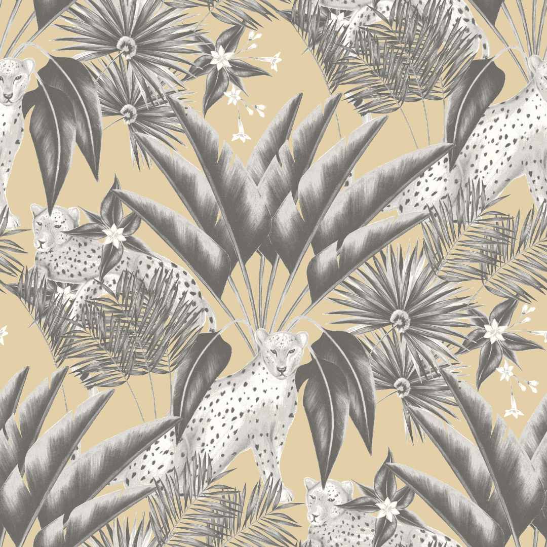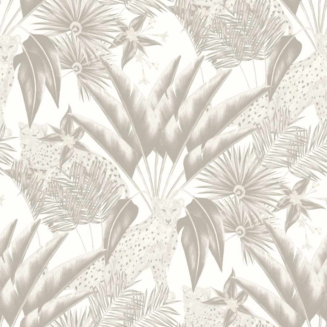 Step foot into the most beautiful tropical jungle with this neutral Jungle Cheetah Wallpaper by Ohpopsi! Discover a lush paradise wallpaper where you’ll find the strength and majesty of a gorgeous cheetah meandering between the dense foliage, its deep coat contrasting starkly against the soft colourway shrubbery.