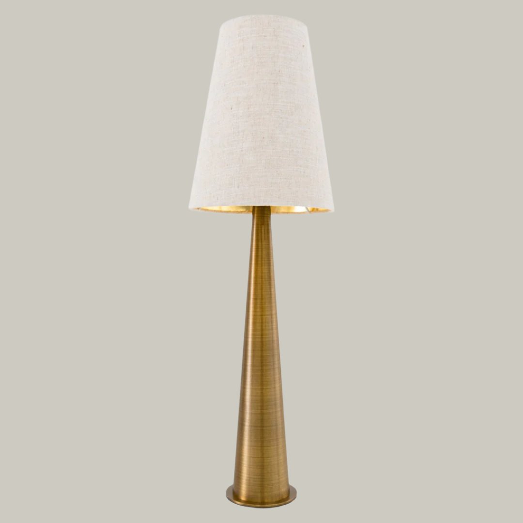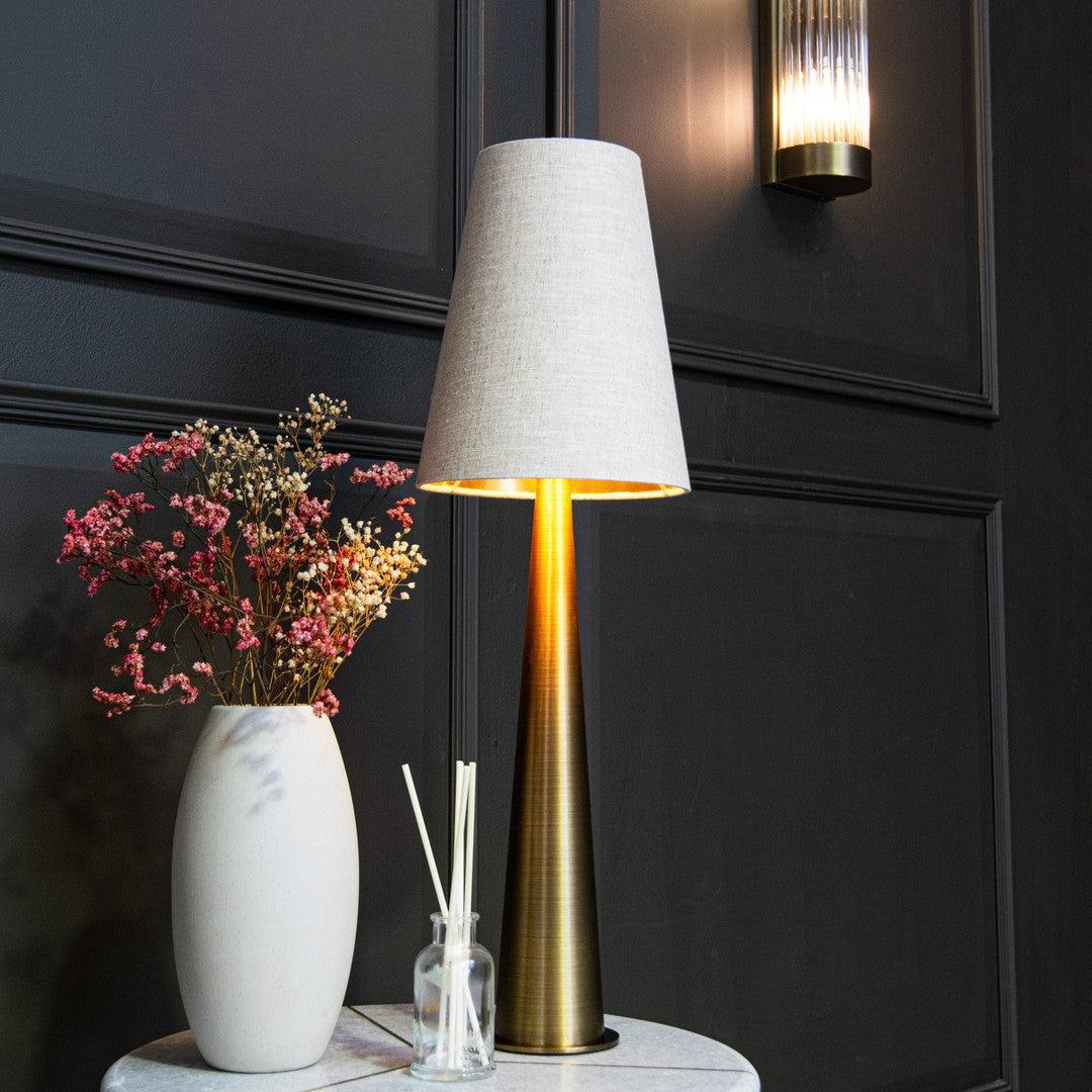 The Juni Table Lamp by RV Astley is a stylish and elegant lighting fixture that features a tall, tapered base with a sleek, antique brass finish. The base is cylindrical, gradually narrowing as it rises, giving the lamp a modern silhouette.