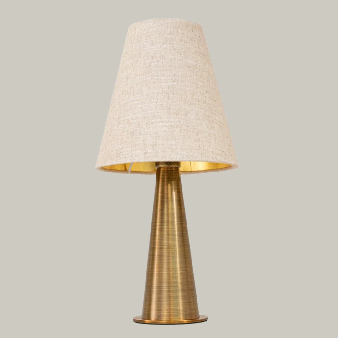 At the top, it is crowned with a classic, tapered lampshade in a neutral, textured fabric that complements the warm tones of the brass. The lamp's design is minimalist yet striking, making it a perfect accent piece for contemporary or transitional interiors. Available in two sizes, the Juni Table Lamp can effortlessly fit into various spaces, offering both functional lighting and sophisticated style.