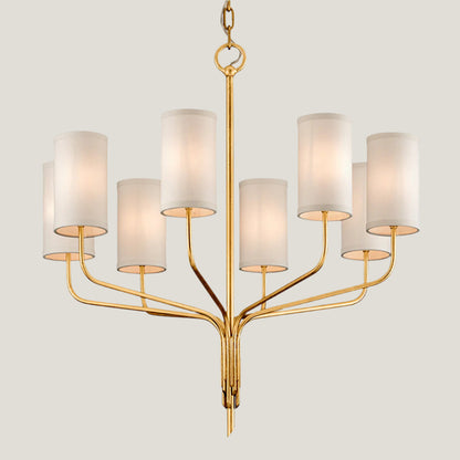 Each of the eight individual arms and shade emits its own chic charm, forming a stunning bouquet of radiant beauty that will be the focal point of any space. As the warm and inviting glow permeates through the shades, it creates an atmosphere that is perfect for any occasion. This gold chandelier will not only enhance your room with mesmerizing visuals but also leave a lasting impression on anyone who beholds it.