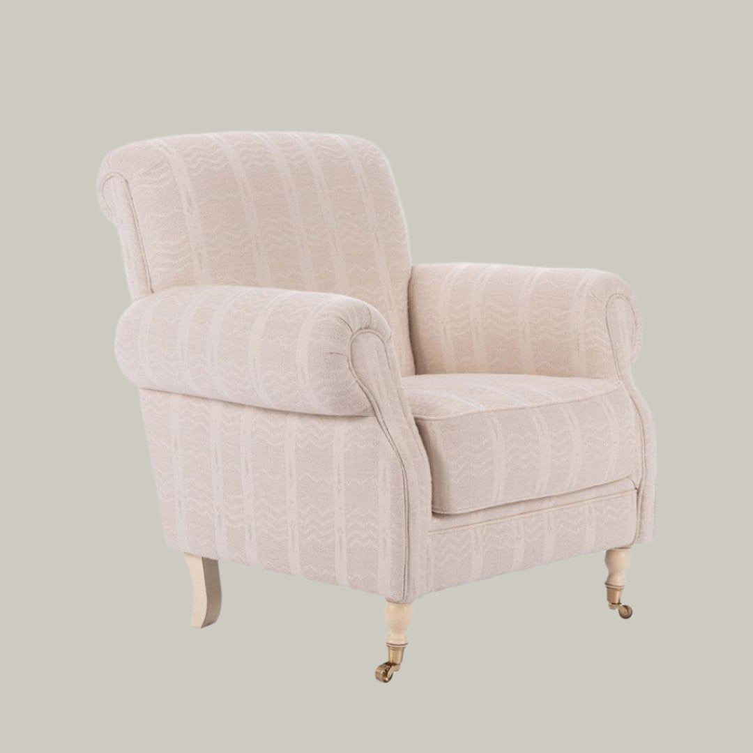 The Kingston Chair upholstered Whitelake Jacquard woven fabric from Mind The Gap is a beautifully designed and extremely comfortable chair that is perfect for any home. With its slightly sloping open back, large rollover arms and fluffy comfortable seater, this neutral colour armchair provides the perfect place to relax in style.