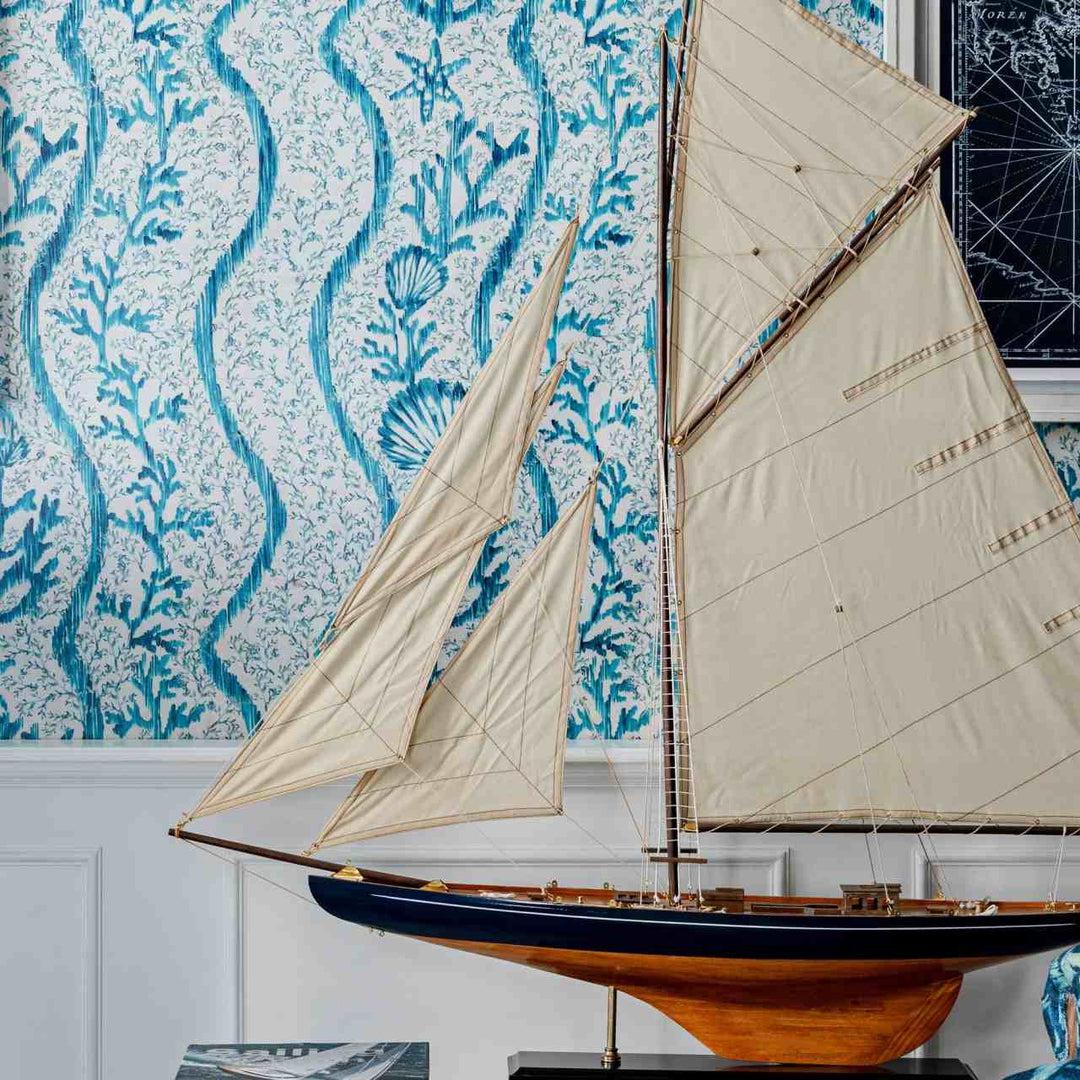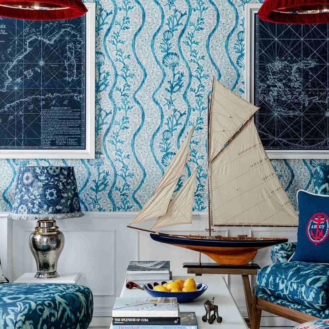 Bring a cool coastal vibe to your home with the striking Koralion Aquamarine Wallpaper by Romanian designer MINDTHEGAP.
