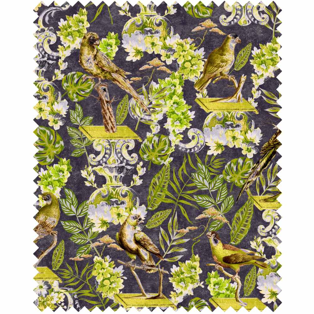 A fabulous flourishing design with lots of beautiful birds and vibrant green foliage on a dramatic anthracite grey backdrop.