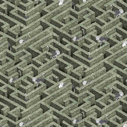 A love for Dutch graphic artist, Escher and mathematical design was the inspiration behind this wallpaper. Technical grids and attention to angles were used to create this continuously rising repeat. Painted with watercolour paints and distressed to create a beautiful texture. Will our feathered friends find their way out of this intricate labyrinth?