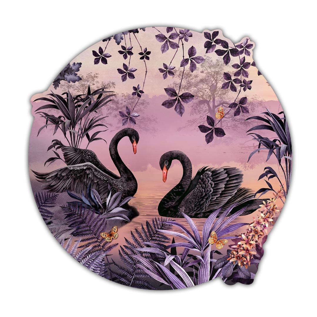 The Lilac Lake Santharia Wall Decal has a stunning, hand-painted scene that depicts two majestic Black Swans as they greet each other on a beautiful lake. The serene purple colours and graceful birds in this decal are sure to bring a touch of elegance to any room in your home.