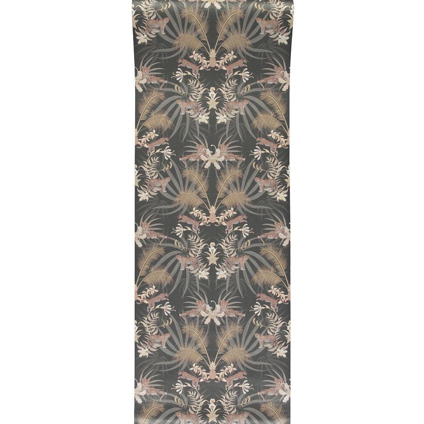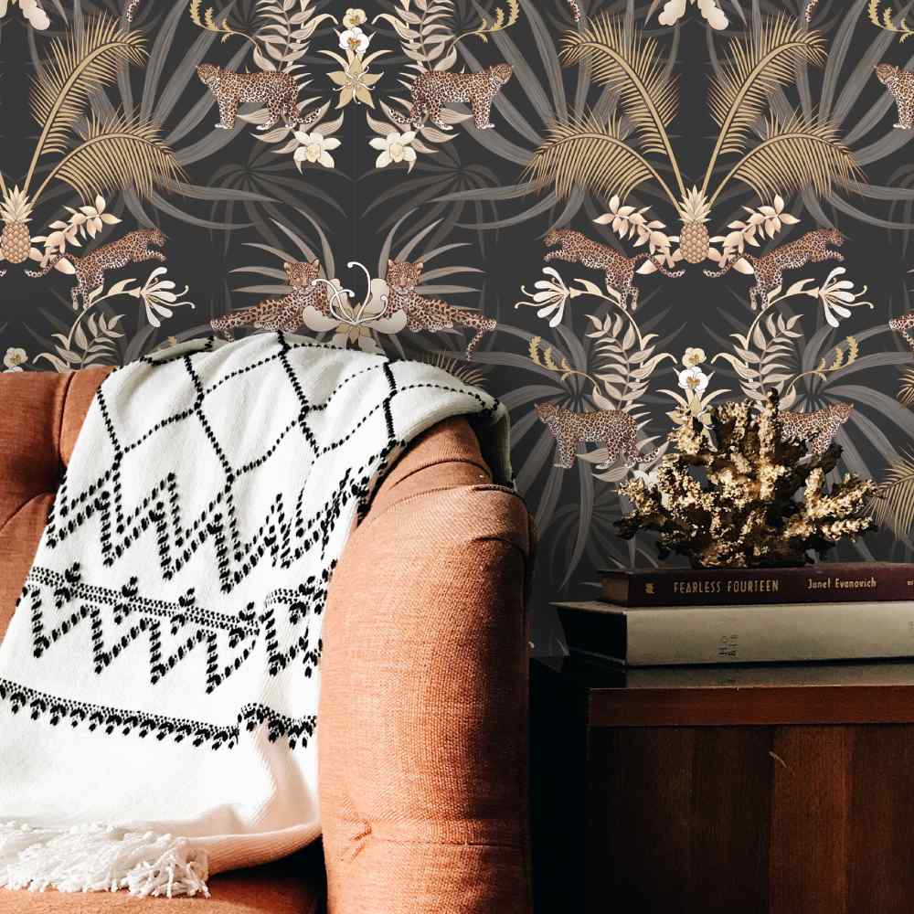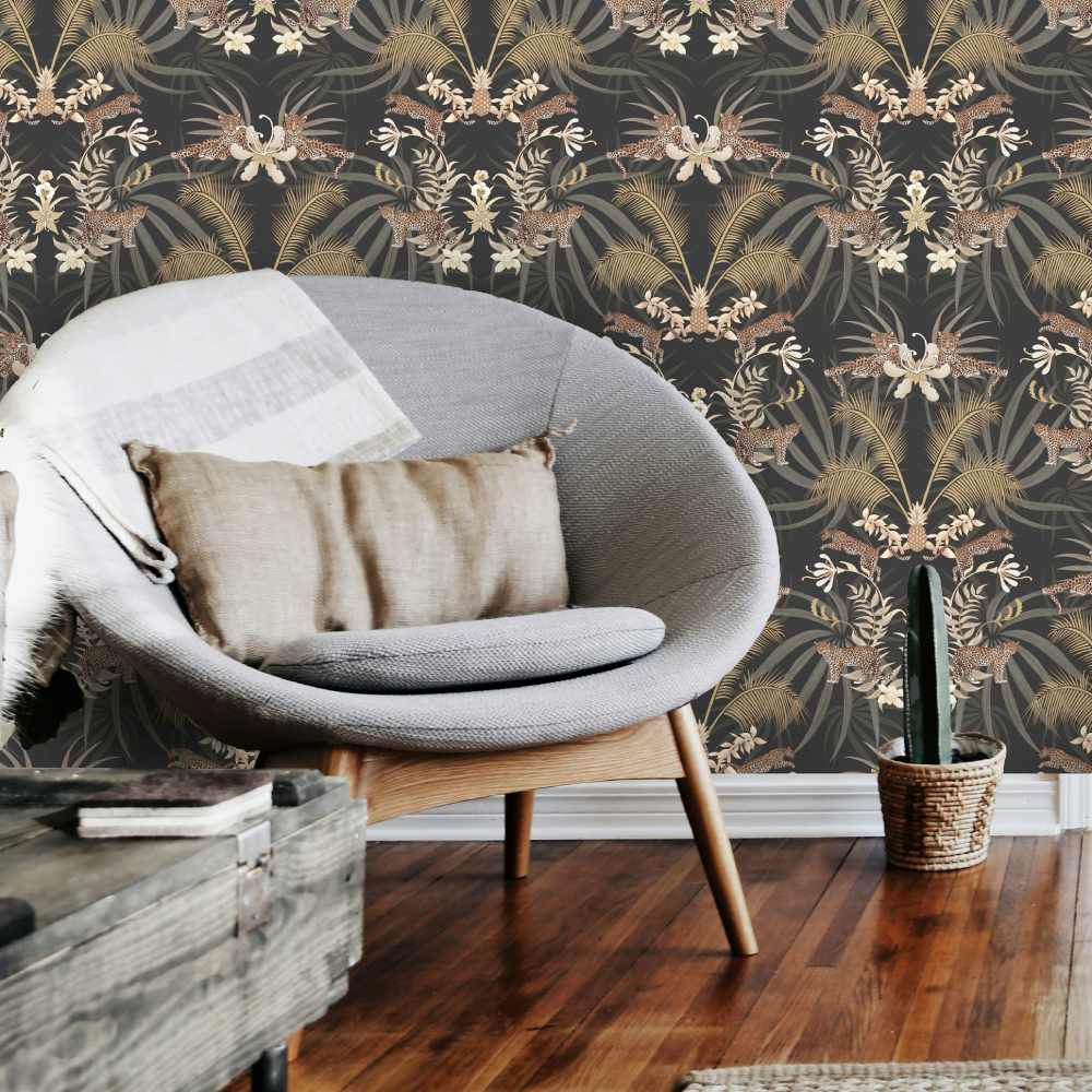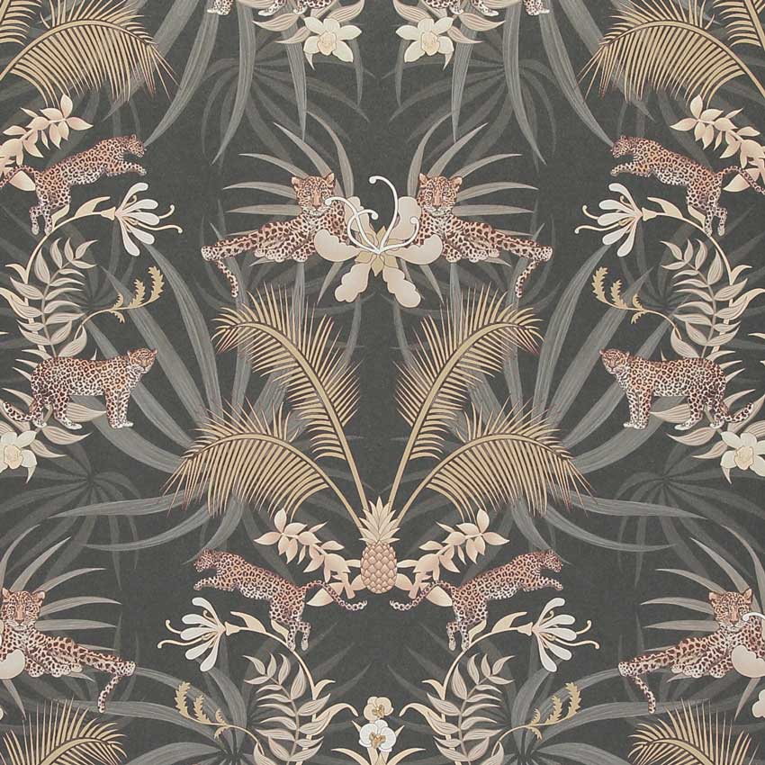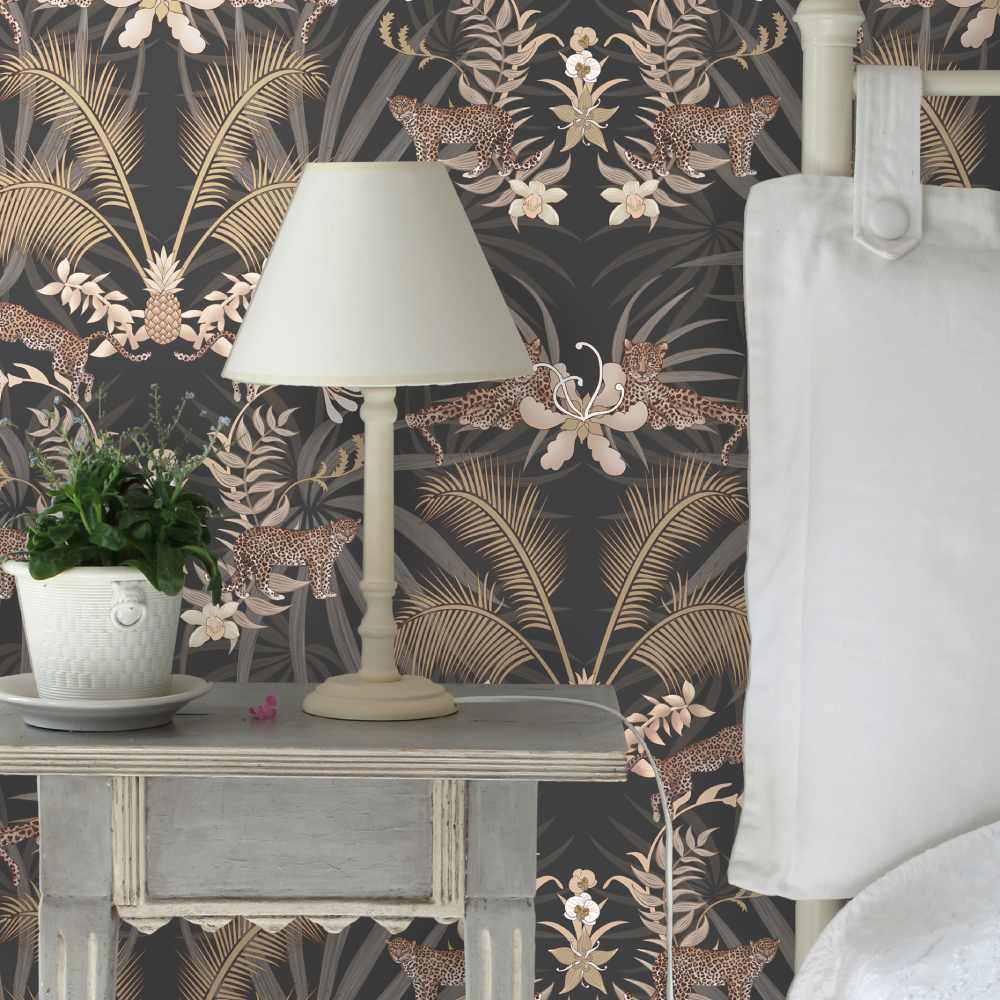 Add a̴ sense of glamour to your home with our stunning Leopard Luxe Wallpaper designed by Becca Who for Graduate Collection. Set on a dramatic Charcoal background, this simple yet striking wallpaper design features leaping leopards prowling amongst golden palms and pineapples, resulting in a majestic design of striking elegance, which creates a beautiful focal point in an interior.