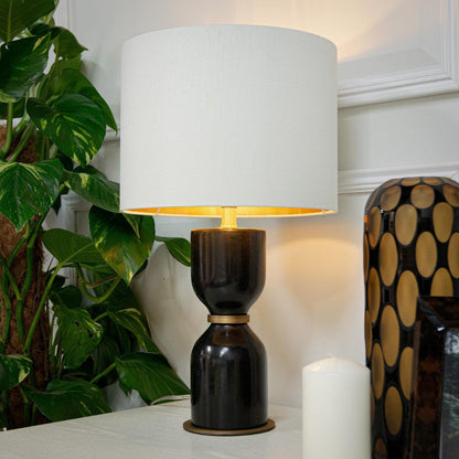 The lamp's base is crafted from pristine marble, adding a touch of luxury to your space. The smooth, marble surface is expertly sculpted into an hourglass silhouette, bringing a modern twist to this classic material. But that's not all – the base is also adorned with subtle bronze accents that perfectly complement the marble, creating a stunning visual contrast.