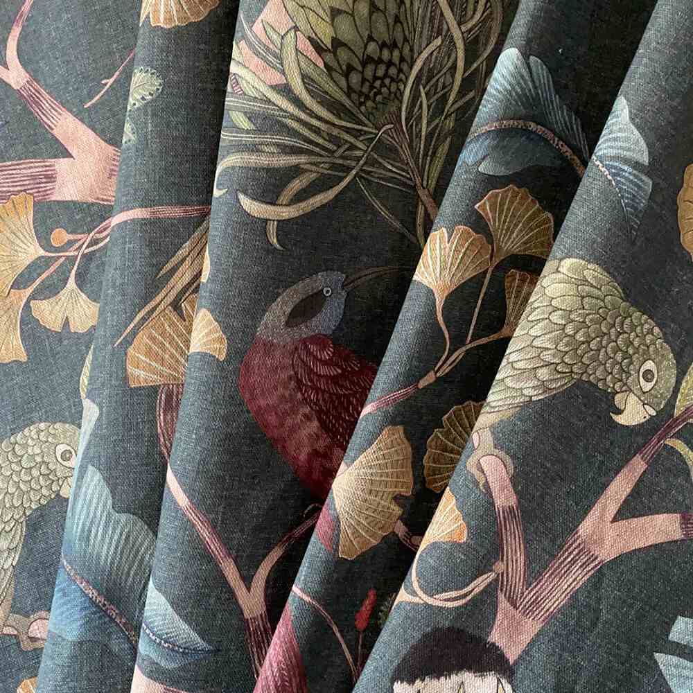 Depicting a hand painted tree full of exotic avifauna and flora, this lush Living Branches Pure Linen Fabric is a beautiful design suitable for blinds, curtains, general domestic upholstery and soft furnishings.