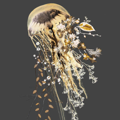 The intricate detail on these graceful marine creatures is truly stunning. Shades of amber, rust, ivory and sand stand out beautifully from the Charcoal backdrop, and look closer you will see the tentacles are made from beautiful flowers.