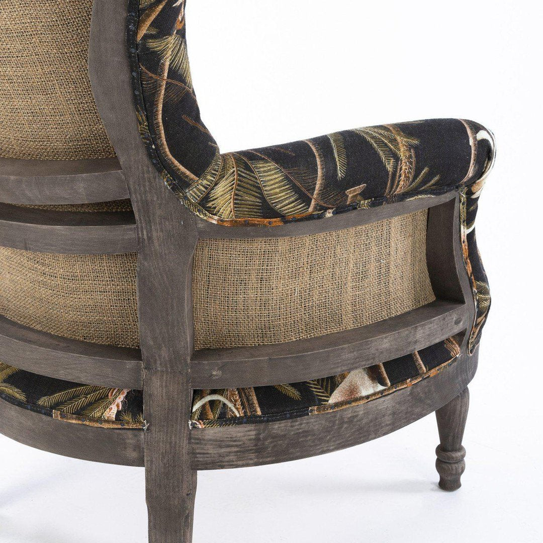 LOUIS is displaying a deconstructed low seat chair with beech wood open back frame, a beautiful lightly turned back and a padded seating. Siting on turned wooden legs with burlap linen on the back and vintage wood frame finishing. This is a contemporary must-have design piece and a perfect armchair for your relaxing time.