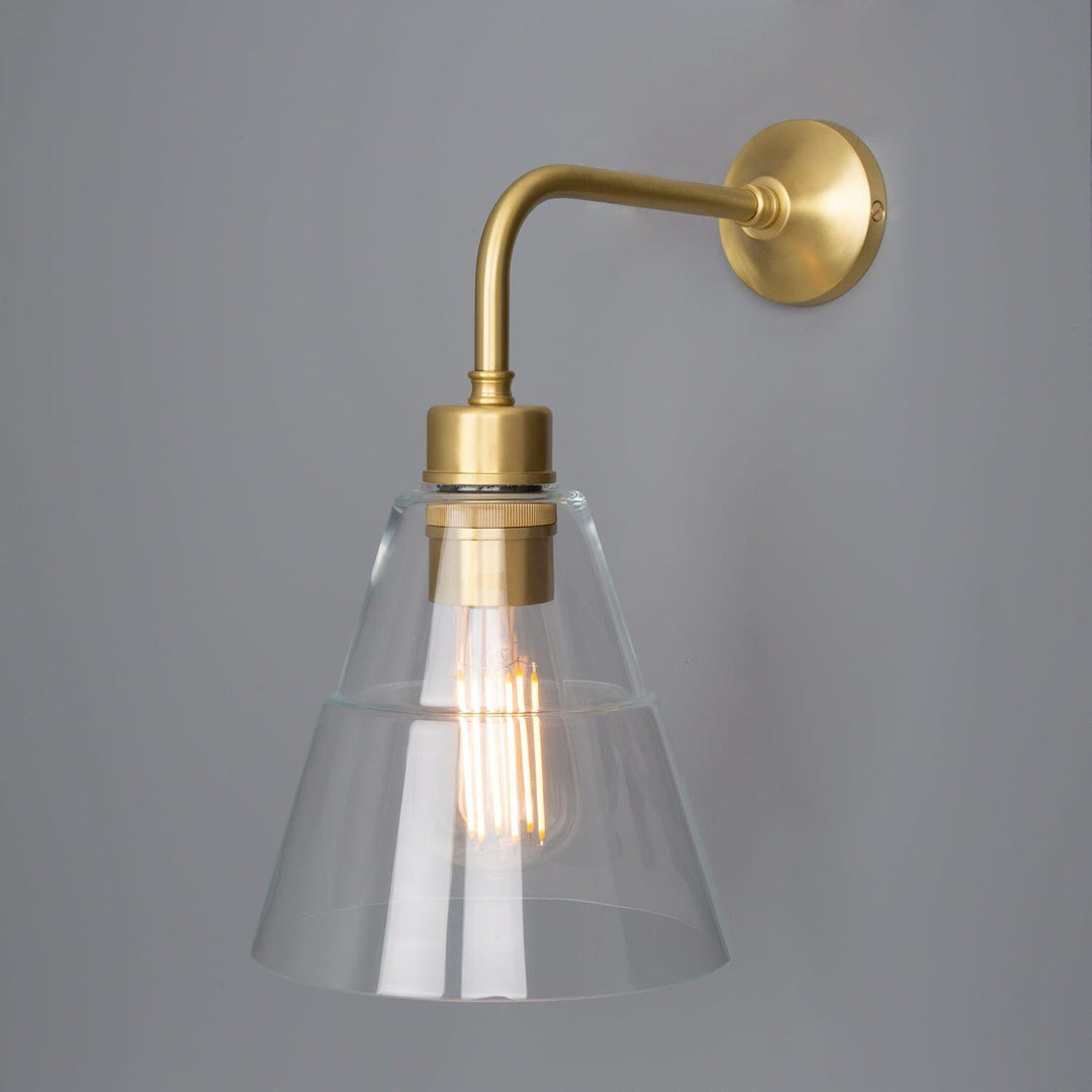 The modern Lyx glass cone wall light by Mullan Lighting is a stylish light with a satin brass holder and sleek clear glass cone.