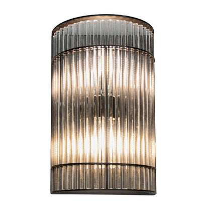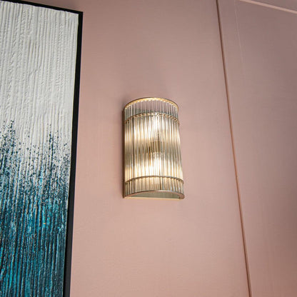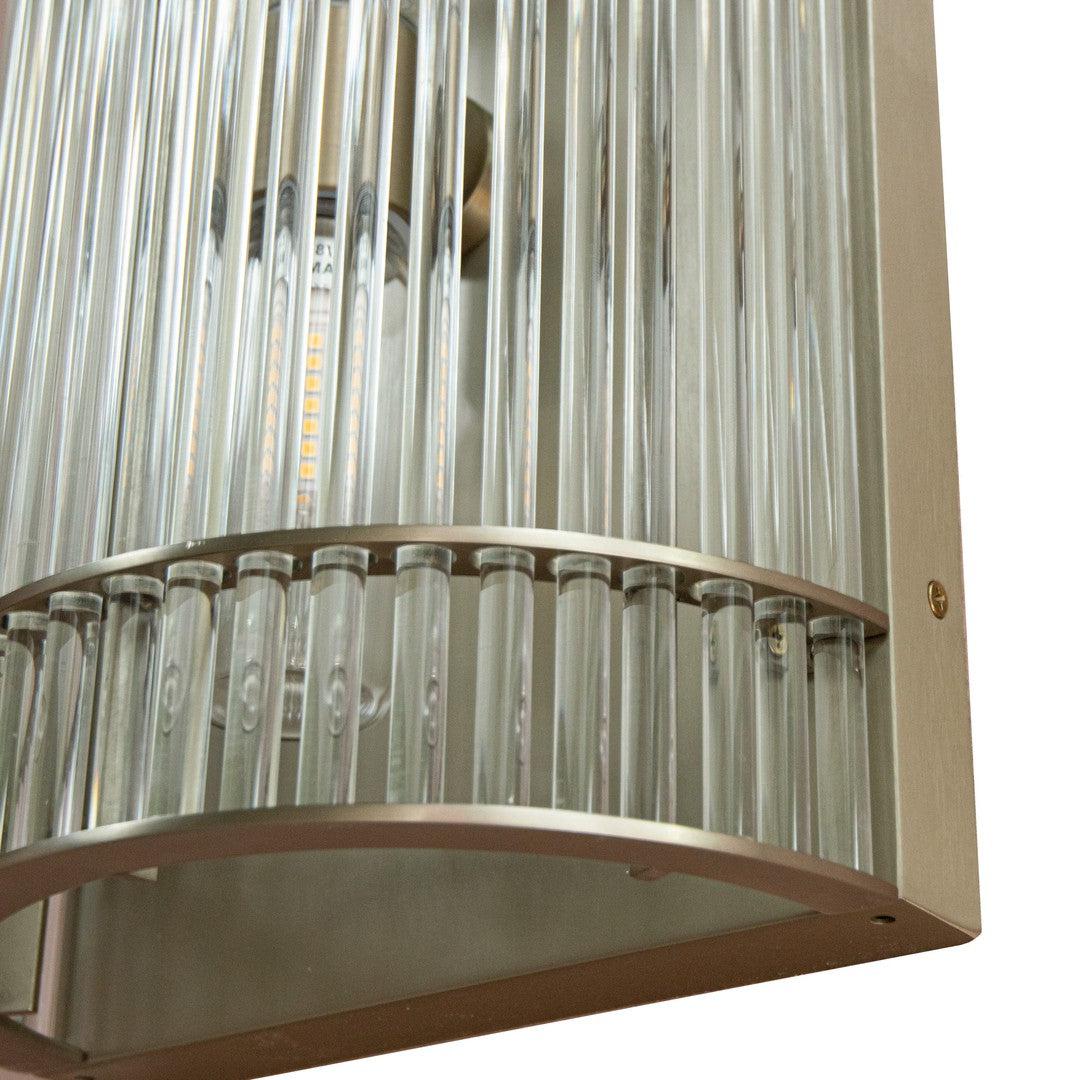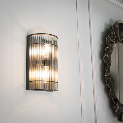 The Macy IP65 Wall Lamp by RV Astley embodies the glamour of Art Deco design with a contemporary flair, making it a striking addition to outdoor spaces. Featuring a sophisticated arrangement of vertical glass rods, the lamp creates a shimmering, reflective effect when lit, while luxurious metal accents add a warm, refined touch.