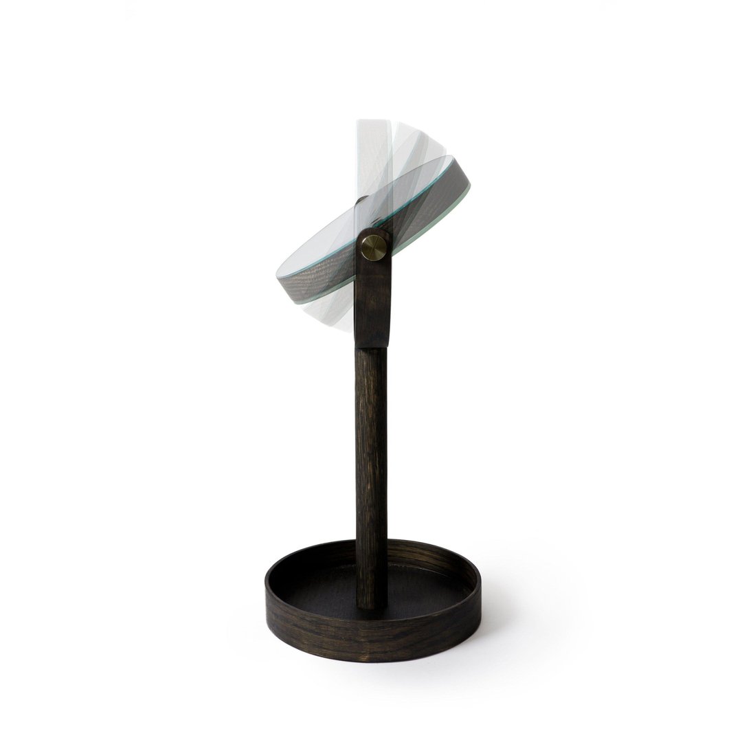 The tall wood stand positions the mirror at a usable height; you won't have to hunch over. The round base is edged and can be used as a tray to hold your personal items like make-up, nail polish or contact lens cases, it's also very stable.