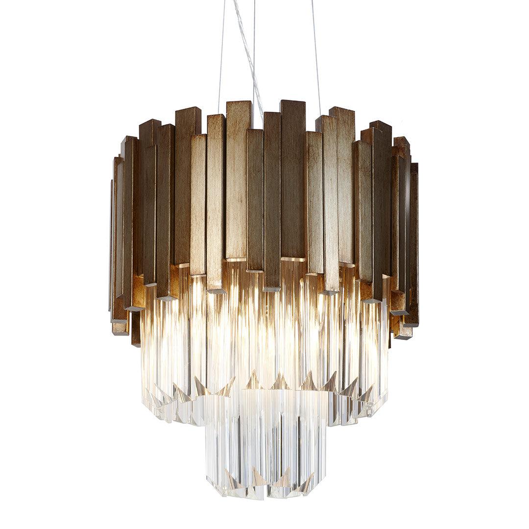 Finished in gold, this stunning ceiling lamp looks unmistakably elegant, with its upper tier of brushed gold bars arranged at various heights. But that’s not all – two smaller glass-effect tiers hang below, giving it a unique and intricate look.