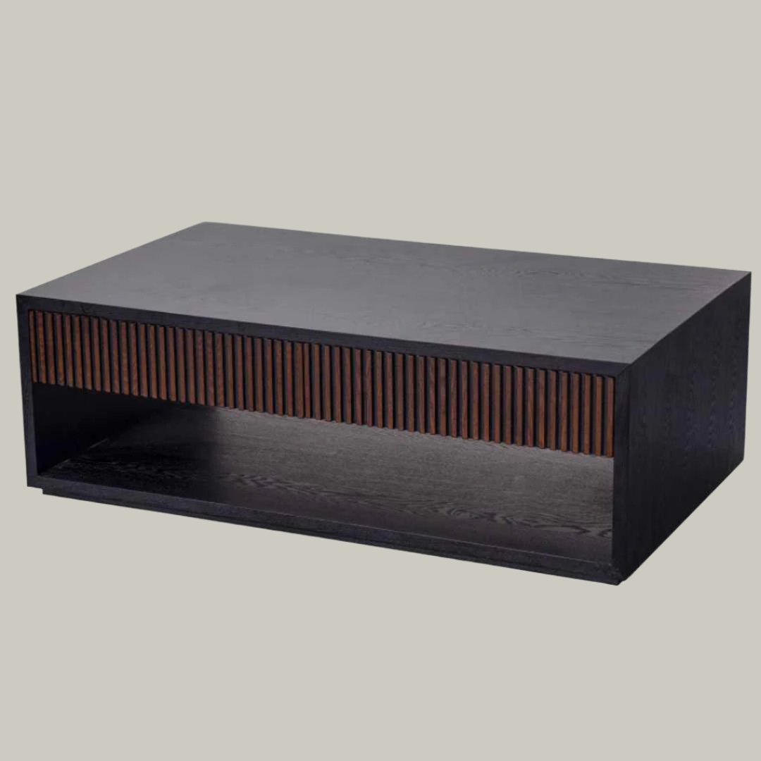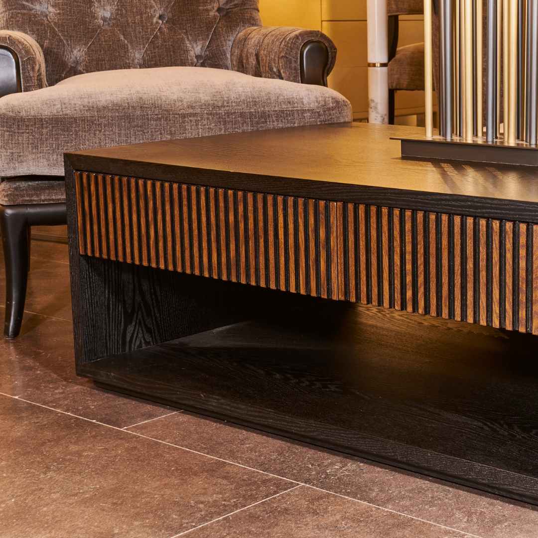 The Marans Coffee Table by RV Astley is the perfect choice for contemporary and modern interiors. Perfect for creating a bold statement, this coffee table uses grooved detailing to bring texture and interest to your living space. With its black wood-grain frame, it’s sure to be the focal point of any room. Its four drawers provide plenty of storage space, so your living environment is both attractive and organized.