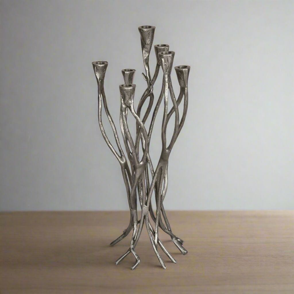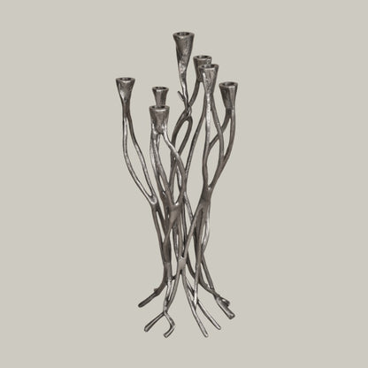This candle holder features seven strategically arranged holders along its flowing form, creating a visually dynamic centrepiece that provides both illumination and style. The intricate detailing of the branch design highlights its craftsmanship, while the rich metallic hue enhances its sophisticated appeal.