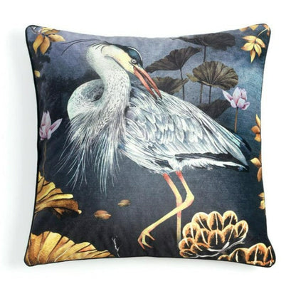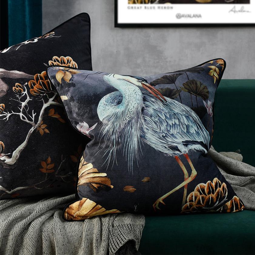 This gorgeous Midnight Orient Piped Velvet Cushion Cover will make a luxurious addition to your home décor. The design features a beautiful hand-painted watercolour heron in a soft moonlit lily pond which is printed on luxurious velvet. Add this cushion cover to your sofa or armchair for an instant update.