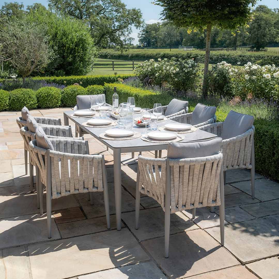Introducing the Milan 8 Seat Rectangular Dining Set in Cool Linen, the ultimate combination of style and functionality for your outdoor dining needs. Handcrafted from premium outdoor rope fabric, this set exudes a sense of luxury and durability. Each piece has been meticulously designed with your comfort in mind, featuring sweeping arched backs on the dining chairs that provide ergonomic support while also adding visual appeal to your patio or garden.