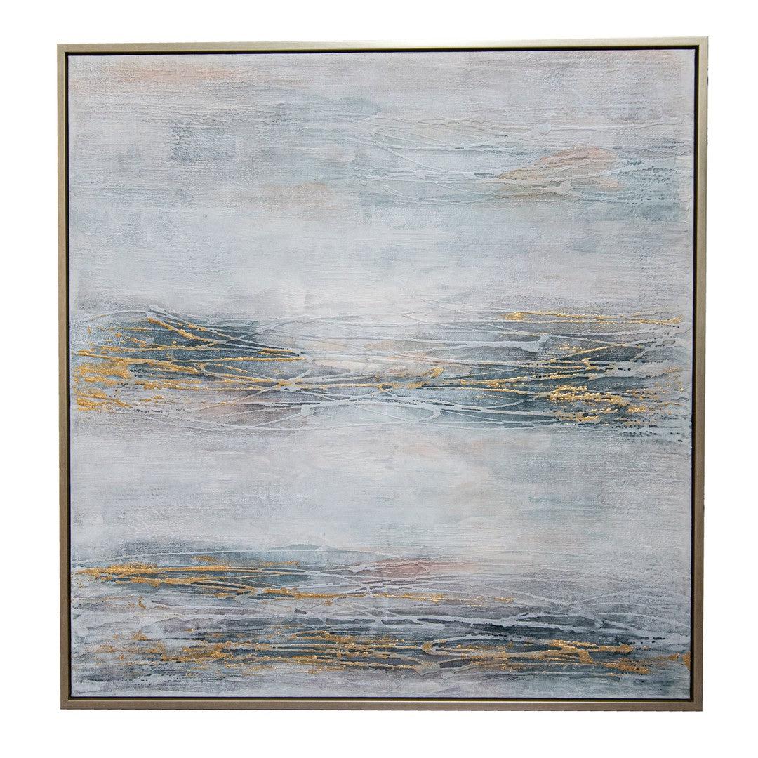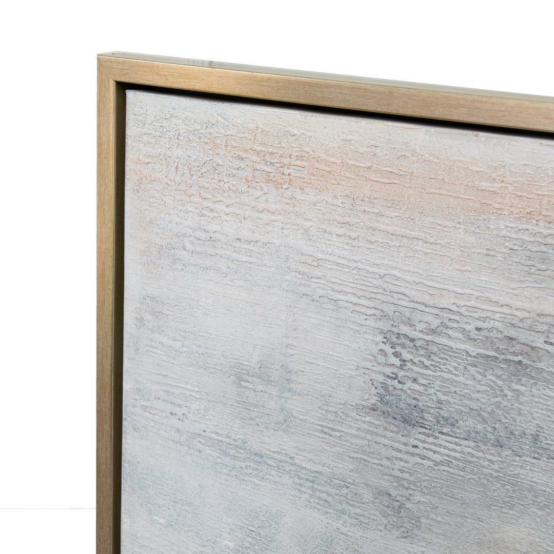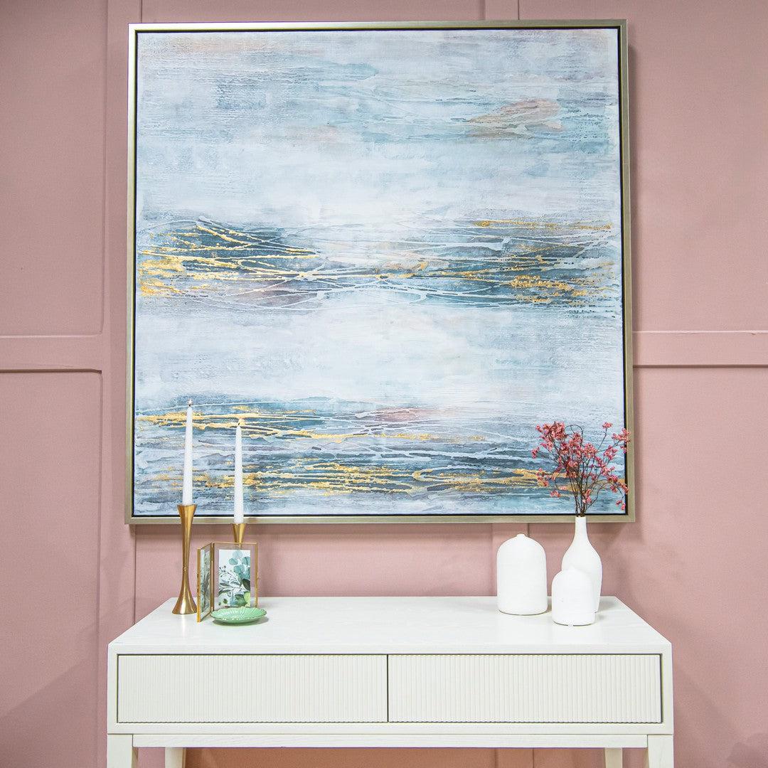 The Mists Canvas by RV Astley is an exquisite piece of abstract art that embodies a serene and ethereal ambience. Its delicate palette of blue, gold, and neutral tones is accented with subtle touches of light pink, adding a gentle warmth. The soft blues evoke a sense of calm and tranquillity, while the gold accents provide a hint of elegance and sophistication. The neutral background enhances the overall harmony of the piece. Encased in a refined champagne frame, this canvas brings an understated luxury and modern elegance to any setting.